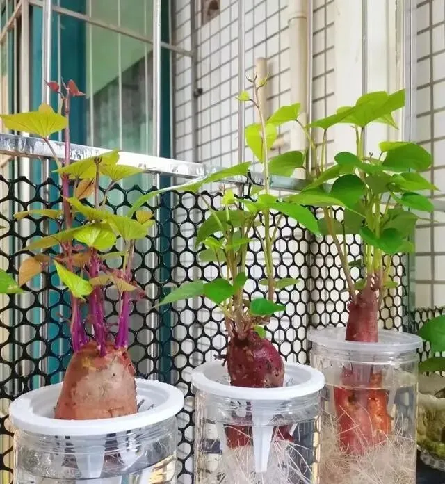 奶茶杯、玻璃杯、随便什么杯 , 装点水 , 红薯往上一架 , 齐活了 , 不用土 , 不用盆 , 干干净净的 , 还特别好看。