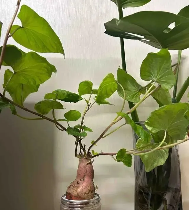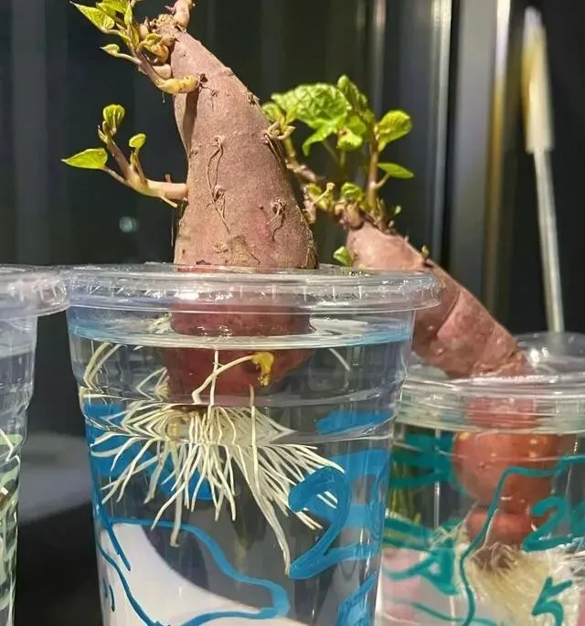 它肚子里全是水分和养分 , 自己就是个"移动粮仓" , 天再干 , 它也能撑住 , 根系又发达得离谱 , 土培的时候 , 一根茎上能冒出好几个红薯。