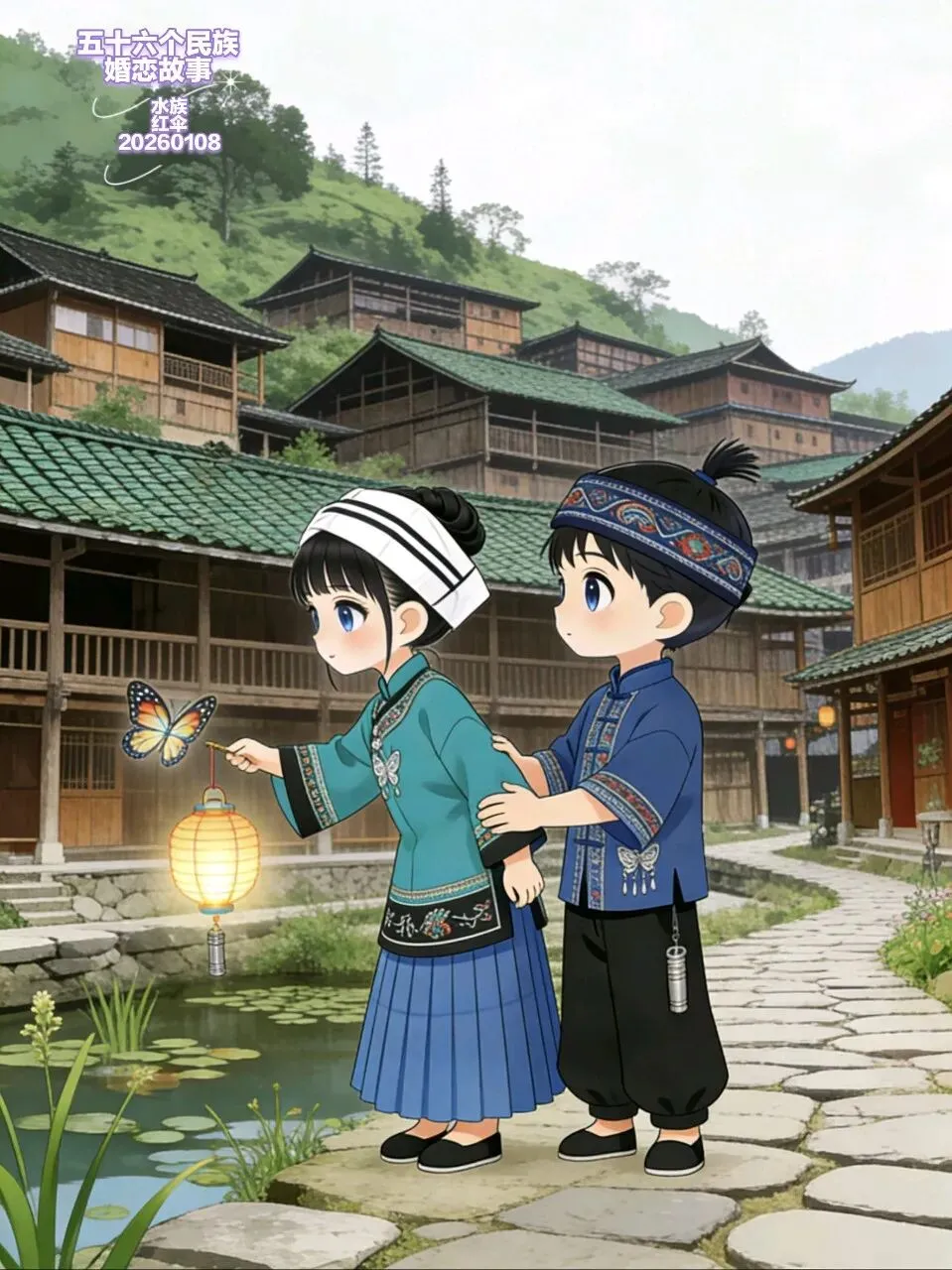 寨里的对歌声此起彼伏,木叶曲吹得缠绵。水妹摸着小铜鼓冰凉的鼓面,指尖划过那些凹凸的纹样,忽然想起阿嬷说的话:水族的铜鼓,是民族的根,也是爱情的盟。铜鼓历千年而不锈,就像水族儿女的爱情,经得住时光磨洗。她把绣好的荷包递给阿朗,荷包上的蝴蝶贴着他的掌心,“阿朗,我信铜鼓的盟约,也信你。”
