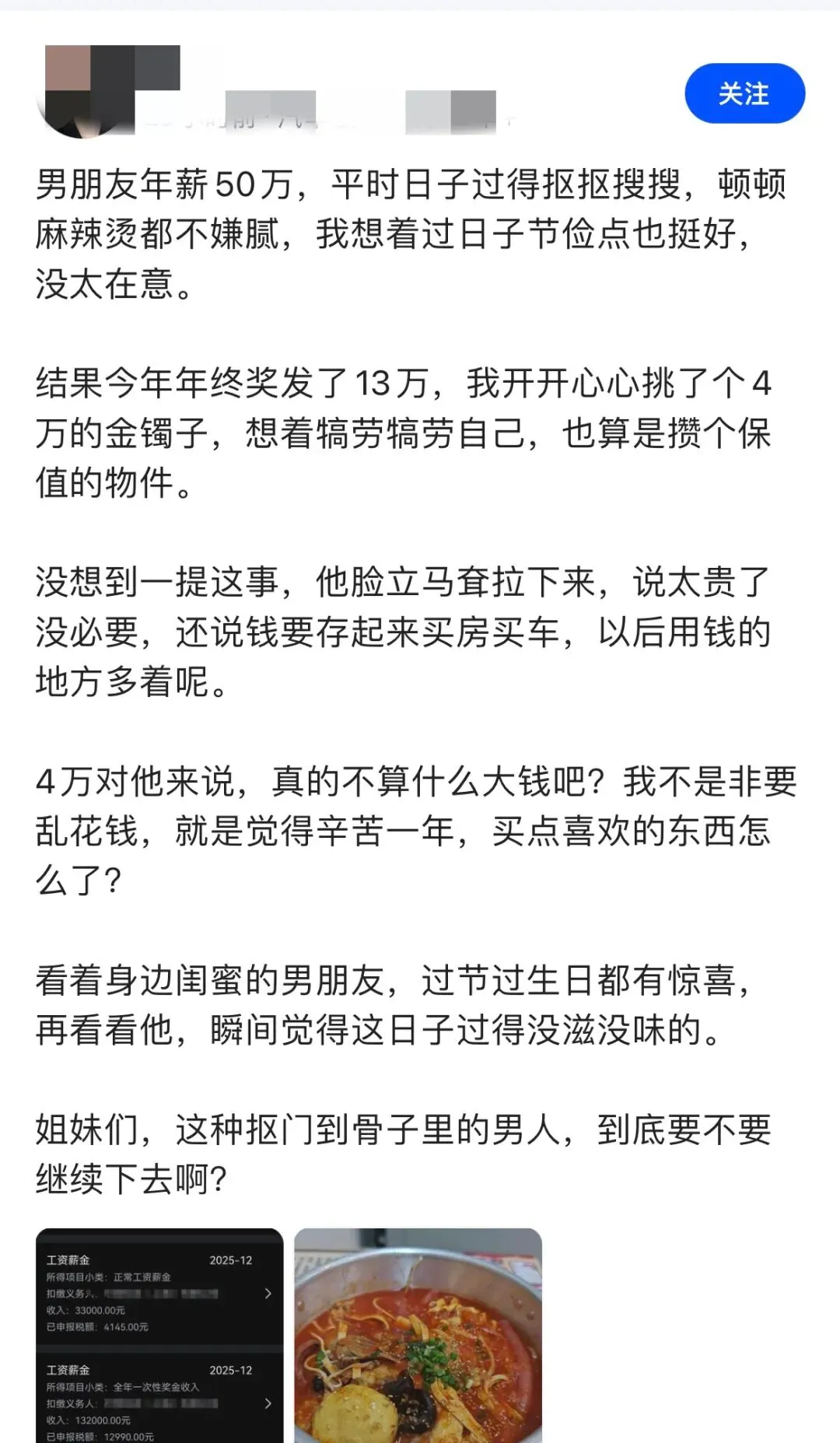 网上看到一个帖子,真的忍不住想吐槽两句。内容是这样的,一个网友说:“男朋友年薪50万,但日子却过的扣扣搜搜的,顿顿麻辣烫都不嫌腻。