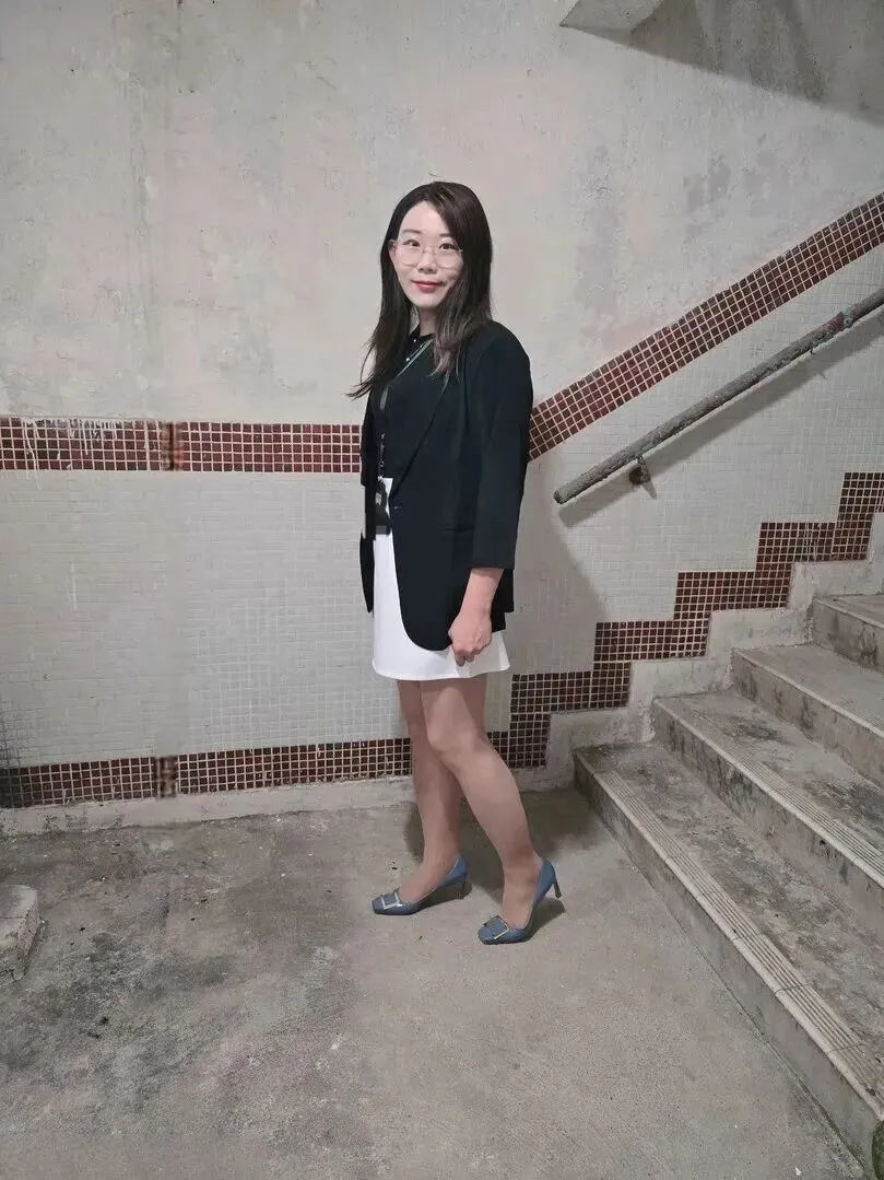 最绝的.是这.双蓝.色高跟鞋.。不是.那种刺眼的.亮蓝色.,带点灰调.,和.黑白.配在一起特.别和.谐。鞋跟大.概五厘米.,走路稳.当,还能悄.悄拉长小腿.线条.。