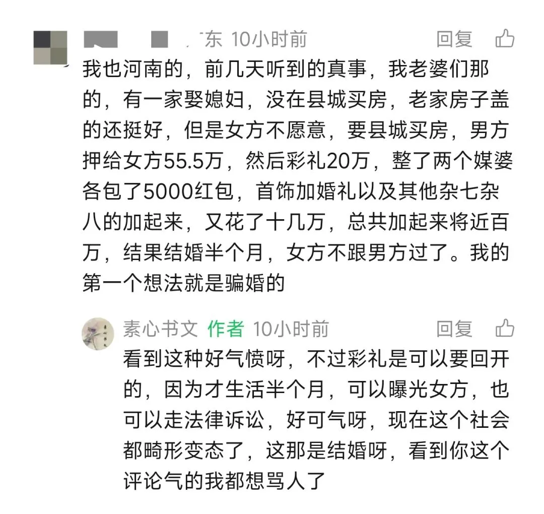 他讲了个真事:“我也河南的,前几天听到的真事,我老婆们那的,有一家娶媳妇,没在县城买房,老家房子盖的还挺好,但是女方不愿意,要县城买房,男方押给女方55.5万,然后彩礼20万,整了两个媒婆各包了5000红包,首饰加婚礼以及其他杂七杂八的加起来,又花了十几万,总共加起来将近百万,结果结婚半个月,女方不跟男方过了。”