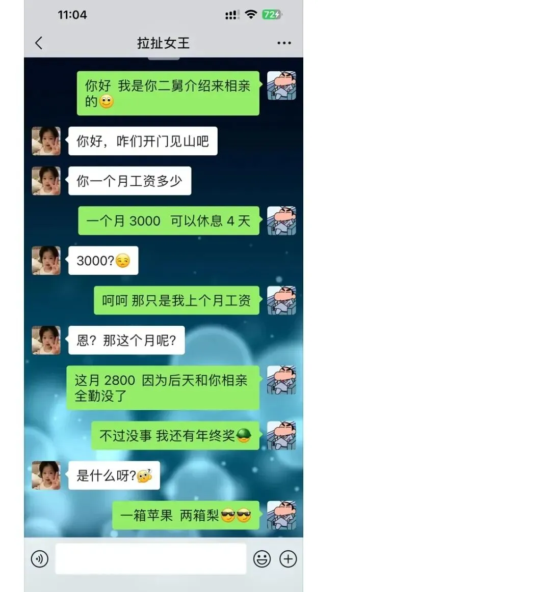 7.你好,我是你二舅介绍来相亲的。