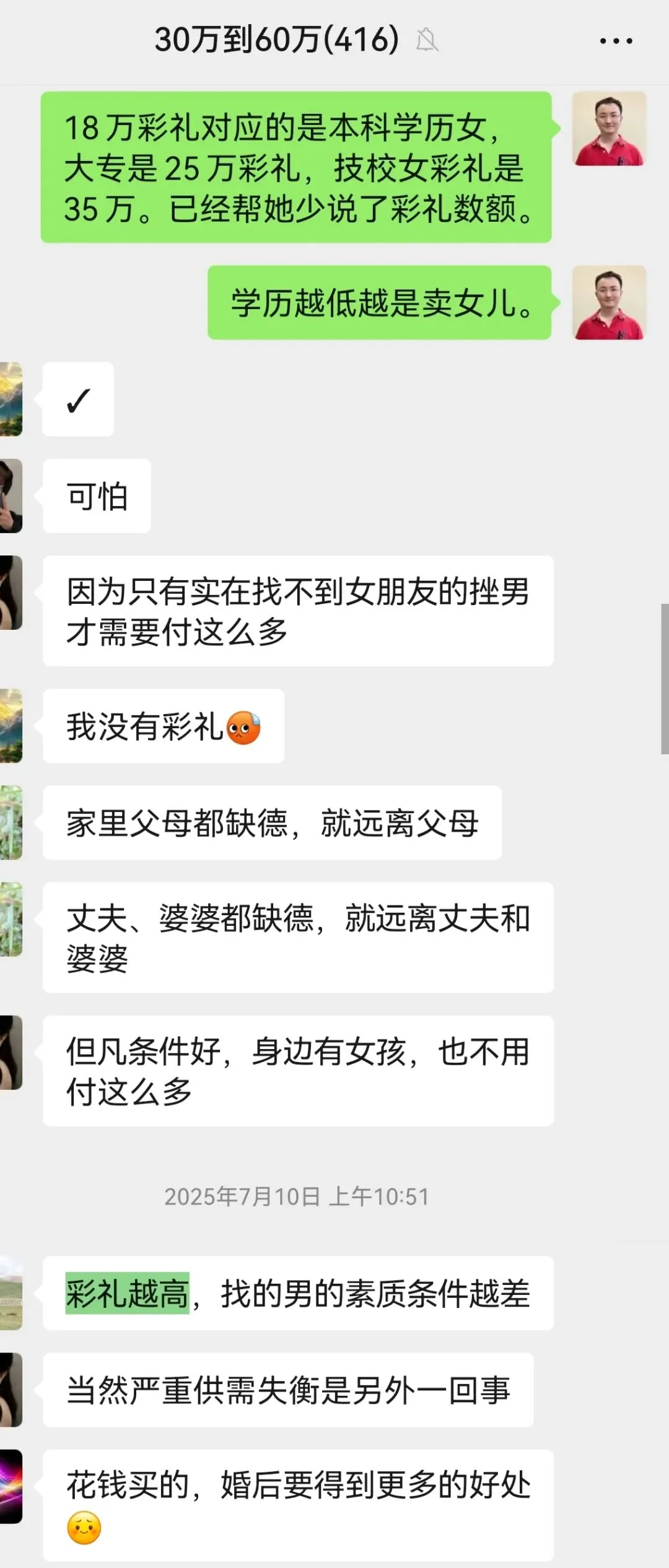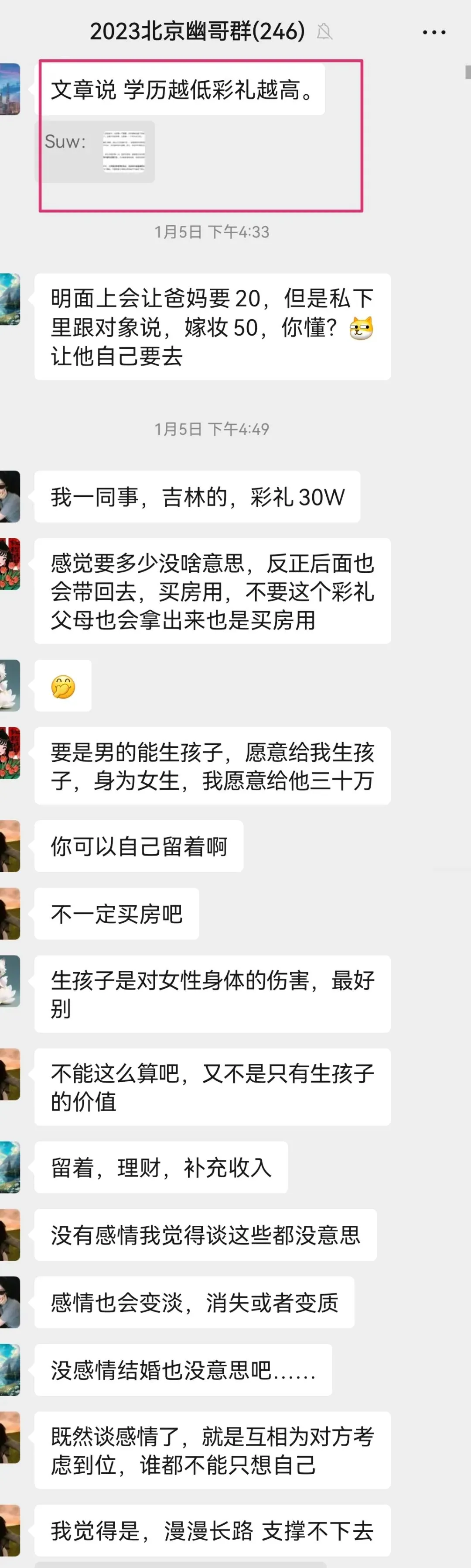 对于彩礼,之前我也讲过一些,有且有很多案例中会提及这块。一般来说,也有些大致的规律。彩礼作为风俗的存在,有其一定的道理,完全不要彩礼,则会对这份婚姻不珍惜,也就是导致婚姻的解体。从这方面来说,彩礼有助于婚姻的稳定和牢固。人对轻易获得实物包括婚姻,不会珍惜,比如婆婆和老公对不要彩礼的媳妇会更凶狠一点,这也是事实,更是人性之一,不需要讲那些违背人性的少数特例。你要知道,学历跟赚钱能力息息相关,所以收入低的女孩自身及其家庭,需要婚姻给与这个女孩下半辈子的物质和金钱保障,彩礼自然越高。用到我们的常见逻辑来讲,就是D女需要靠婚姻来生存,没啥不好意思的,古来就如此。当然,彩礼本身是男性抬起来的价格,因为有实力的父母给儿子出得起高额的彩礼,这样他的儿子才优先有了结婚的机会。愿意出高价彩礼的父母,一般会有些实力,但是他们的儿子大多比较普通,甚至是C男、D男。高额的彩礼是相对经济不发达地区的,传统思维比较重的一种婚姻习惯。还有,家里有弟弟的女孩,一般会要求较高的彩礼,这是为了缓解弟弟娶媳妇的压力,古代还有换亲这一说,互相避免高额彩礼。当然,一般有感情的婚姻,比如谈了3年结婚,一般彩礼会少要点。而相亲后立即开始的结婚,彩礼则比较高,且一分不让。这里感情算彩礼的润滑剂,可调节彩礼高低的意思。很多男方甚至让儿子出去“骗”感情,从而达到少给、不给彩礼的目的。此外,彩礼主要是双方父母商谈的,小两口尤其未婚的男女朋友之间谈彩礼金额,一般是不算数的。因此,我们标题所述的:“男朋友准备对彩礼砍价,怎么办?”更可能是这样一种情形:“男朋友之前答应我的彩礼金额,现在他突然想减少几万,我该怎么办?我不答应,也很生气!”这个主要是该女孩不了解彩礼的意义,也不知道彩礼该是双方父母去谈,彩礼本身也是2对父母给这1对小辈建立新家庭的原始资金,并不是被某人独吞。读了大学的女孩,应该更了解彩礼为何物。当然,她可能更生气于未婚夫的出尔反尔。但可以理解,他也才是个小伙子,第一次经历婚姻,也不懂这些,被人一说,甚至只是收到亲友、家人之一的影响,就容易改变思维,所以来找你“砍价”。“幽哥,您好,坐标湖南,硕士女,31岁,事业编。相亲认识的男朋友,和我同城,硕士,比我大2岁,我们都是非独生子女,在一家私企工作,工资比我高一些,不过平时加班多。”尽管俩人都硕士了,但是地处湖南,是有较高的彩礼习俗的,仅次于江西。而且是相亲认识的,所以确实民间需要彩礼,而且不会太低。但是女方有优势,在体制内。“目前相处一年多,之前没有产生过矛盾,近期因订婚前协商彩礼问题,产生了一点矛盾。男朋友两天前承诺18.8万,昨天临时改口说要降低2万,16.8万,后因为我说了临时有变这一点让我感觉到不太舒服。”这就是男孩受到父母、家人的影响,彩礼想砍价2万。其实也不多,可以答应的。但是女孩对于这种变卦,比较生气。俩人都可以理解。“他看到我有些不开心,又改回原来的数字。马上要订婚了,我突然变得有点犹豫。不知道要怎么办?我其实不在乎少这两万,就是这种改变,让我感觉到不被重视。求幽哥指点一下,谢谢。”但是具体金额得你们双方的父母去敲定,否则后面你们双方还会继续吵架,发生矛盾,因此彩礼之外还有其他三金五银、婚礼、婚宴、婚房等等事宜,没必要你俩新人夹在4个父母和更多的亲人之间,受他们影响。让双方父母直接谈为好。这里谈不上他的性格多变或者出尔反尔,你自己也会突然受到其他同学的挑唆影响,会提出涨价或者主动降低彩礼、婚宴等要求。总之,祝你们百年好合!不要因小事而影响爱情、婚姻。