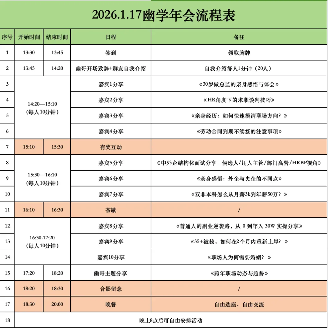 今年的年会,线上线下同步进行,时间放在1月17号(周六)14:00-20:00,日程如下: