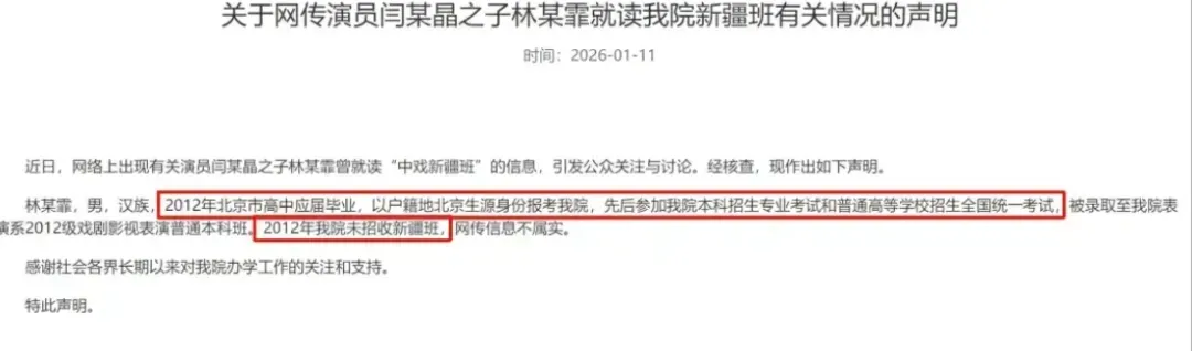 根据中戏发布的公告可知林某霏是2012年北京高中应届毕业生,以户籍地北京生源身份正常报考中戏,且2012年中戏未招收新疆班。