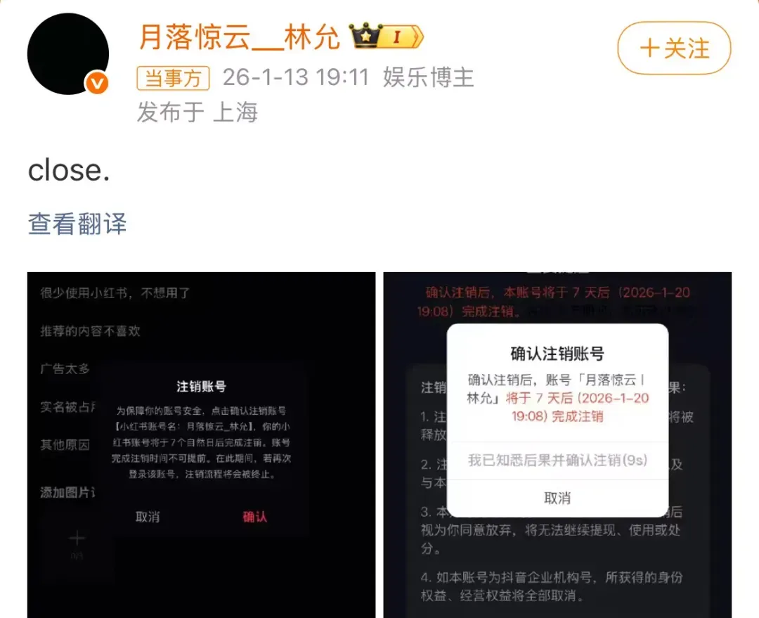 林允的站姐突然开始关站,并且开始走注销账号的流程,还是多个平台账号同步注销的那种,给人的感觉就是有什么大事发生了;