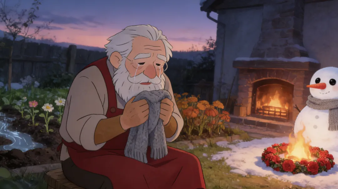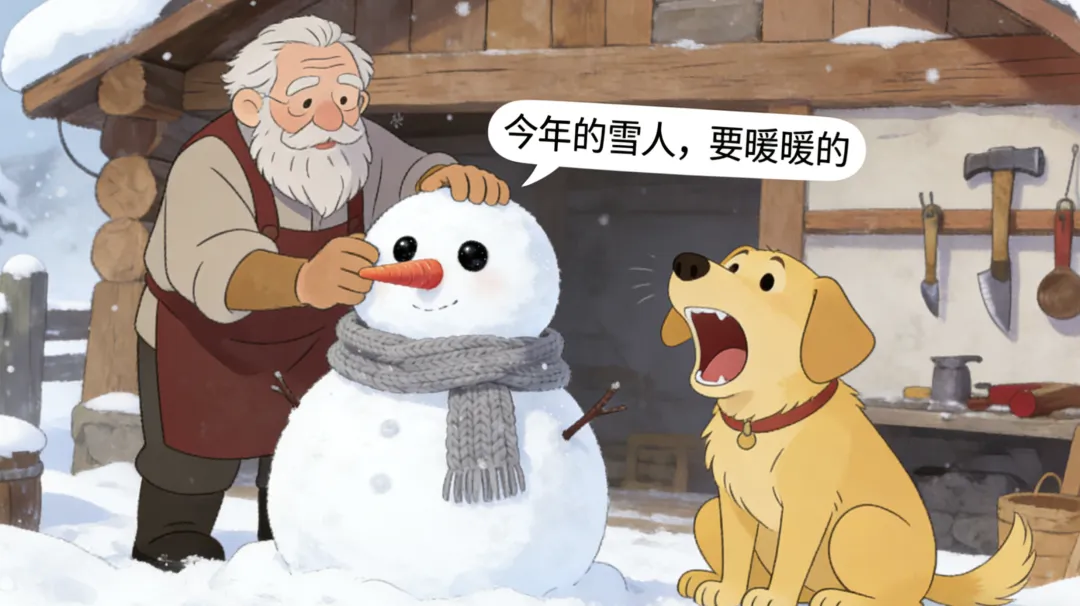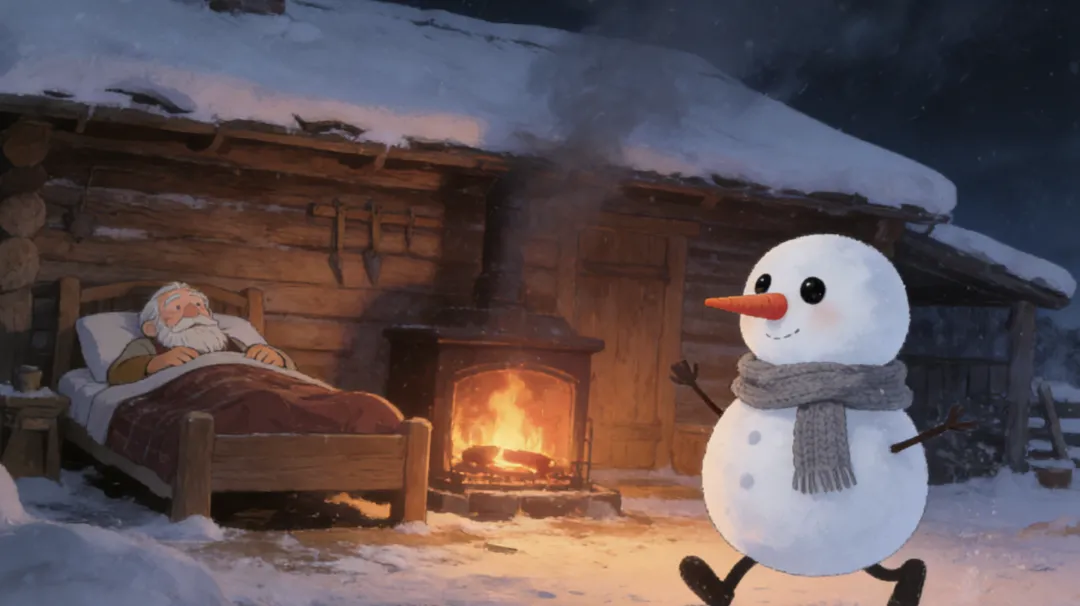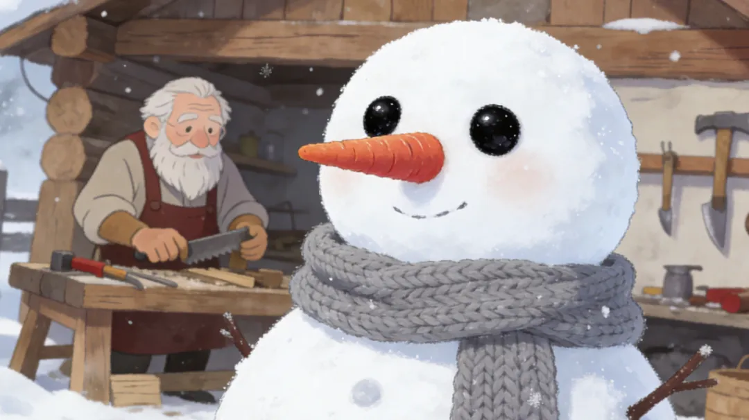 雪人站在院子里,看着屋里的火光越来越暗,急得直跺脚。它想起老木匠堆它时粗糙又温暖的手,想起老木匠给它围围巾时,嘴里念叨着“今年的雪人,要暖暖的”。它突然做了个决定。