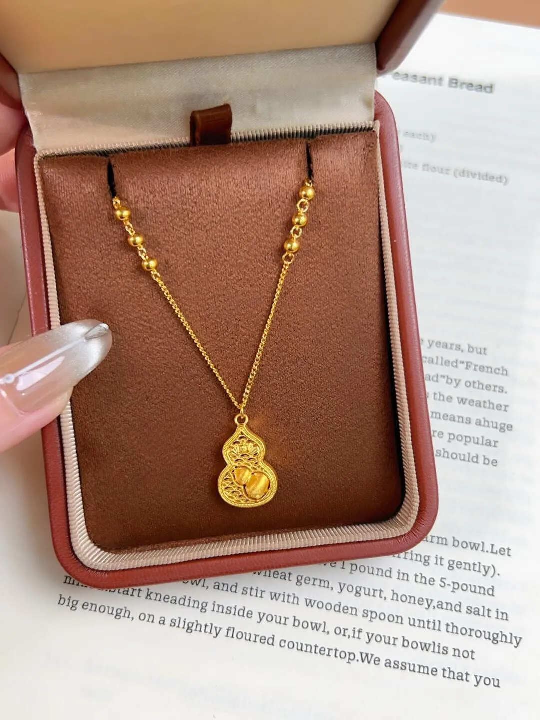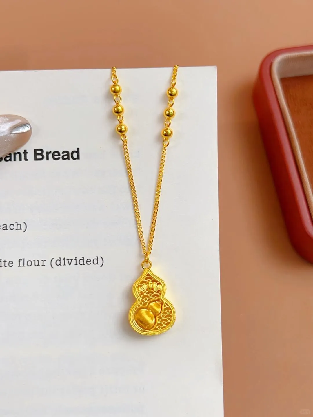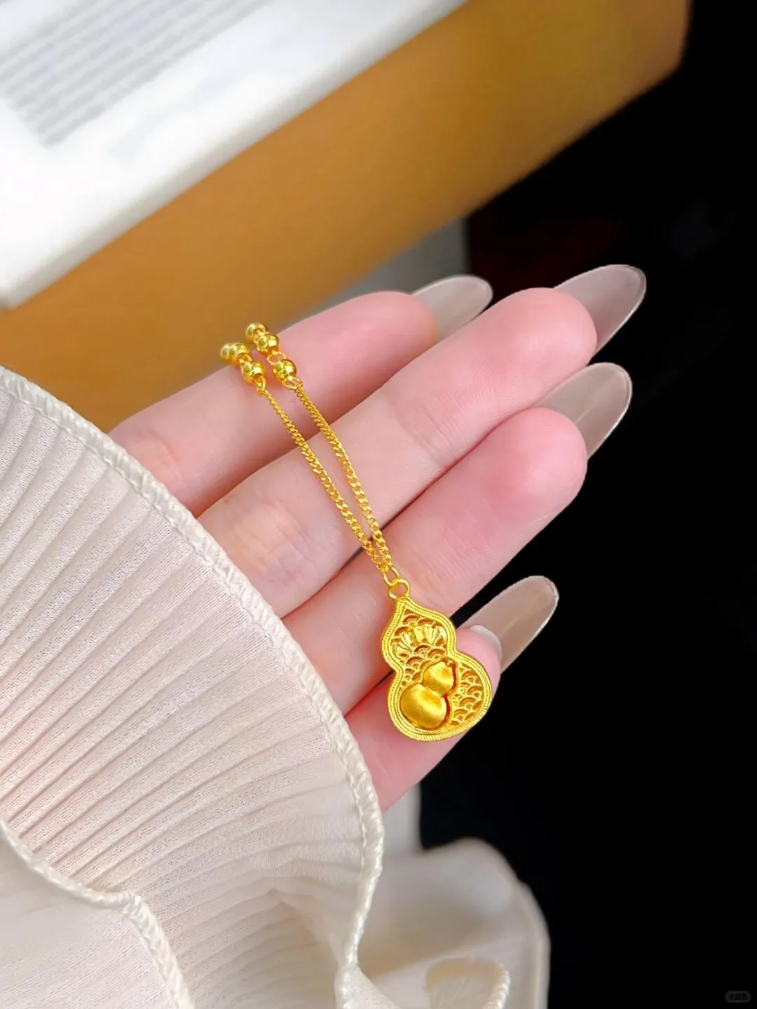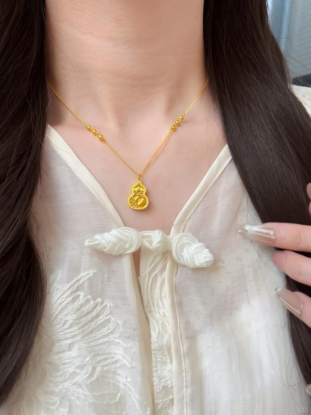 职场女生选这类带明显寓意的黄金项链 我觉得有两个小点要注意 一个是造型的线条要干净 这条葫芦就是轮廓收得很利落 不会一堆花纹堆在一起 所以哪怕你是做金融 咨询这种偏正式行业 也不会显得夸张 第二个是长度和重心 这条的重心很稳 走路不会乱撞 也不会转到后面去
