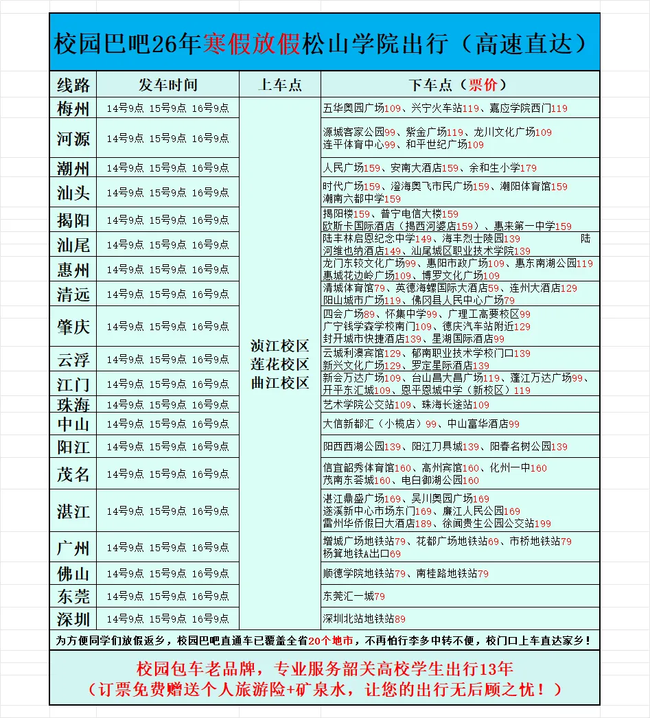 3,已覆盖全省20个地市及区县,不再怕行李多中转不便,校门口上车直达家乡。