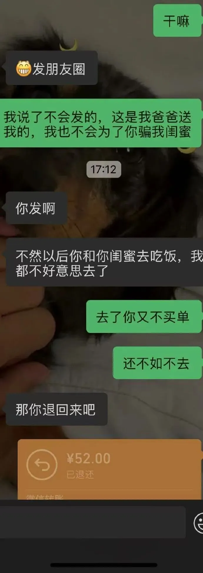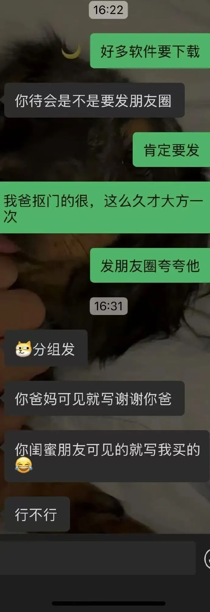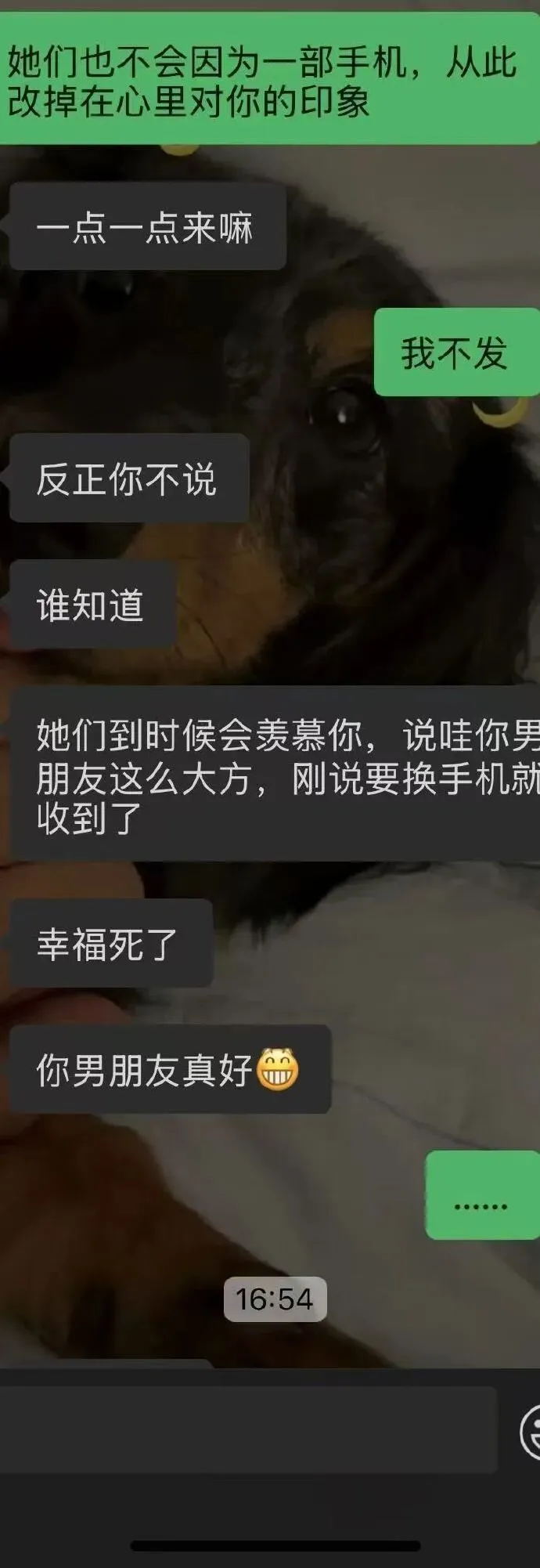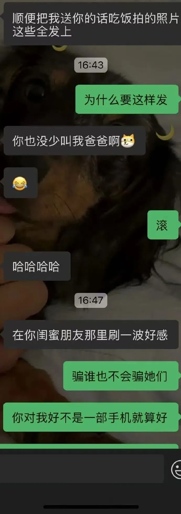这次生日我爸爸送了我手机,男朋友知道就让我发朋友圈分组,发给我的几个闺蜜看,假装是他送给我的,博取我闺蜜对他的好感。