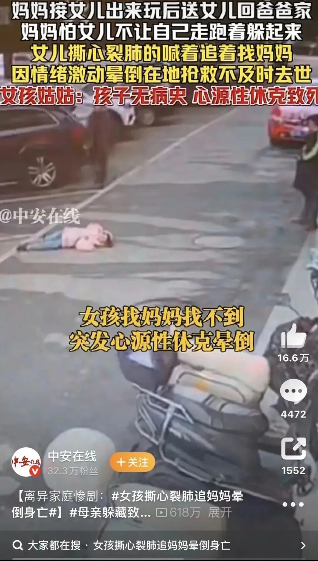 年幼的女孩发现妈妈不见后,撕心裂肺地哭喊追逐,途中突发心源性休克,经抢救无效不幸离世。法医确认,孩子此前无相关病史,极端情绪应激是这场悲剧的主要诱因。