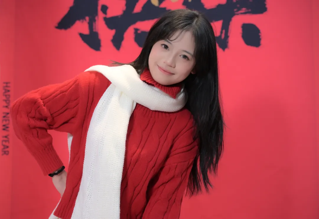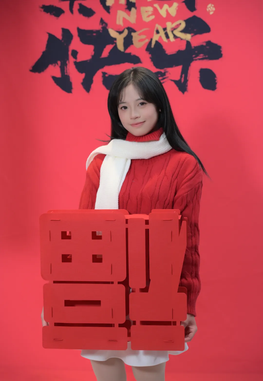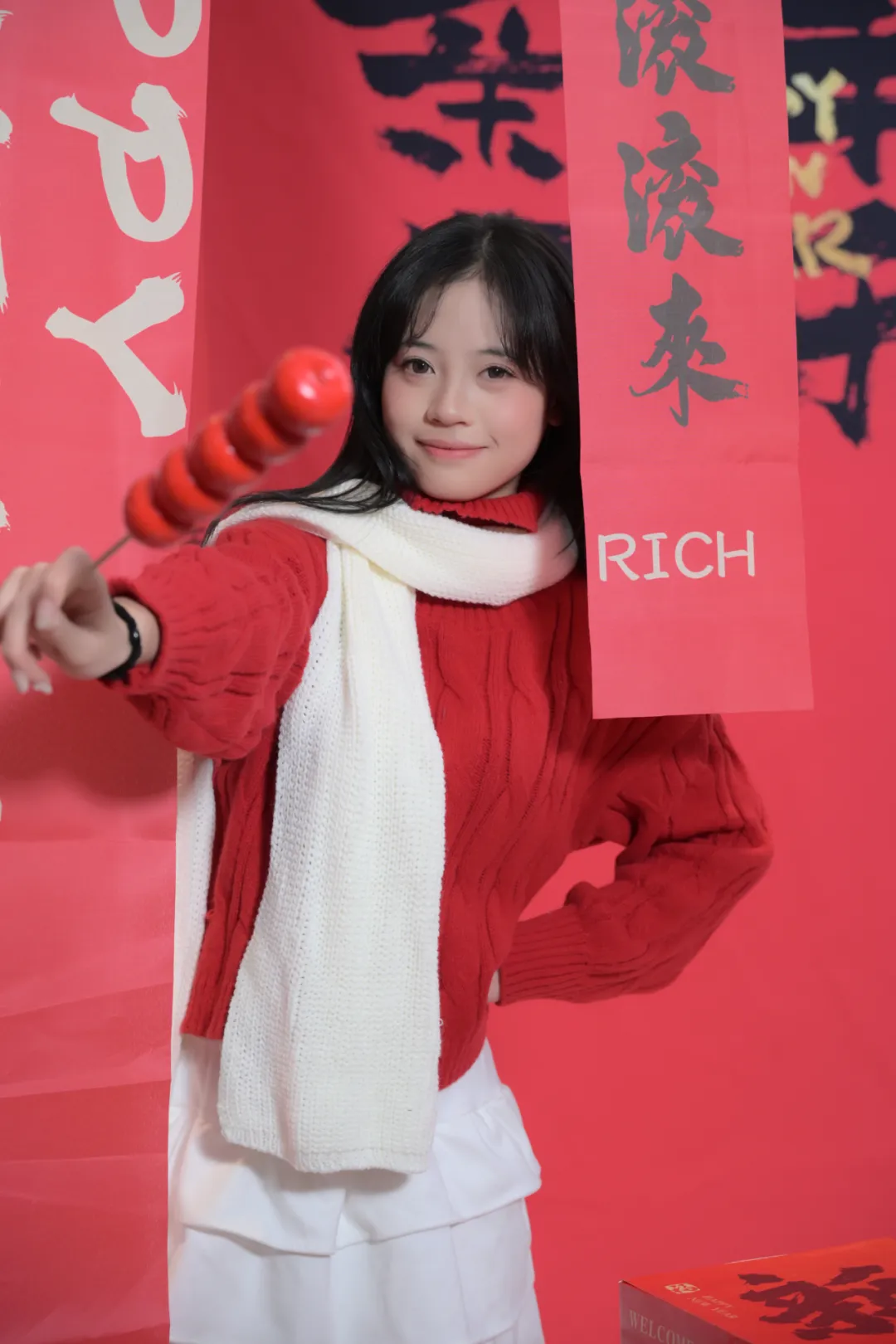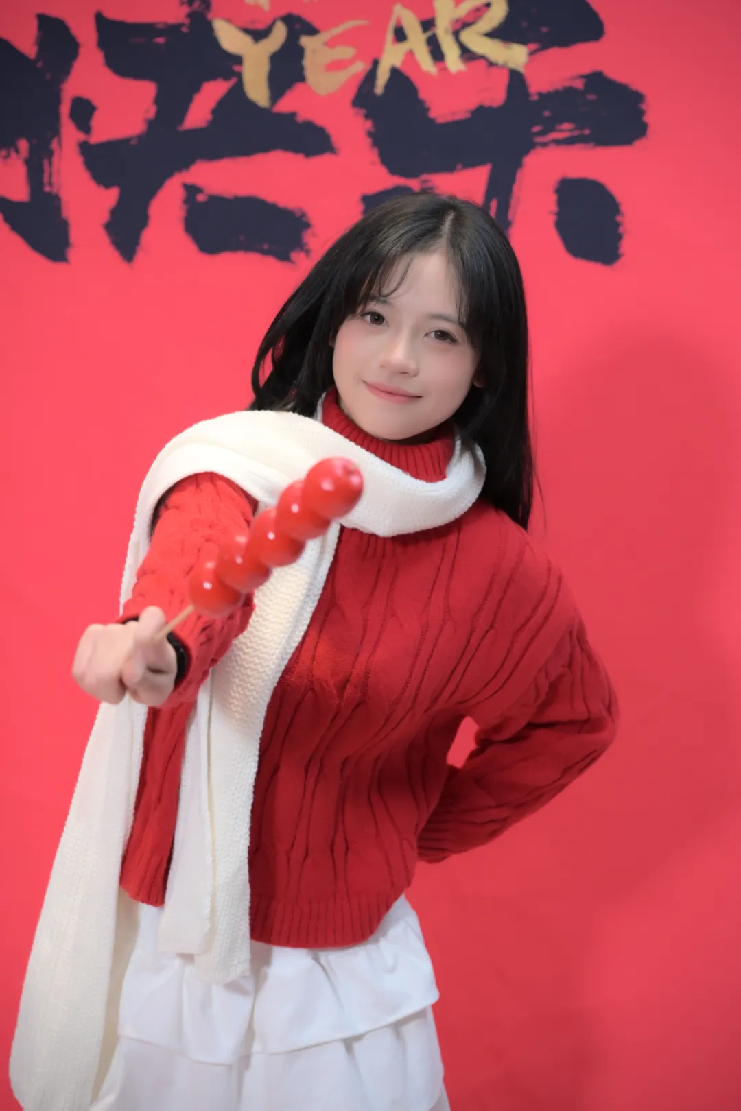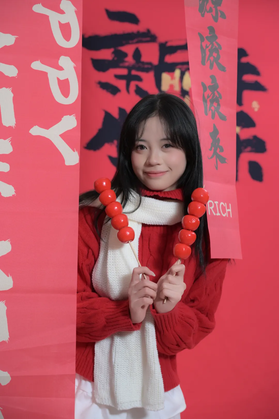 ,穿红色衣服,可以配个白色围巾,因为我这个是室内拍的,打了灯光,所以白色的毛线围巾有点发黄,不过无伤大雅。可以找个干净的背景,搭配春节的主题道具进行拍摄。