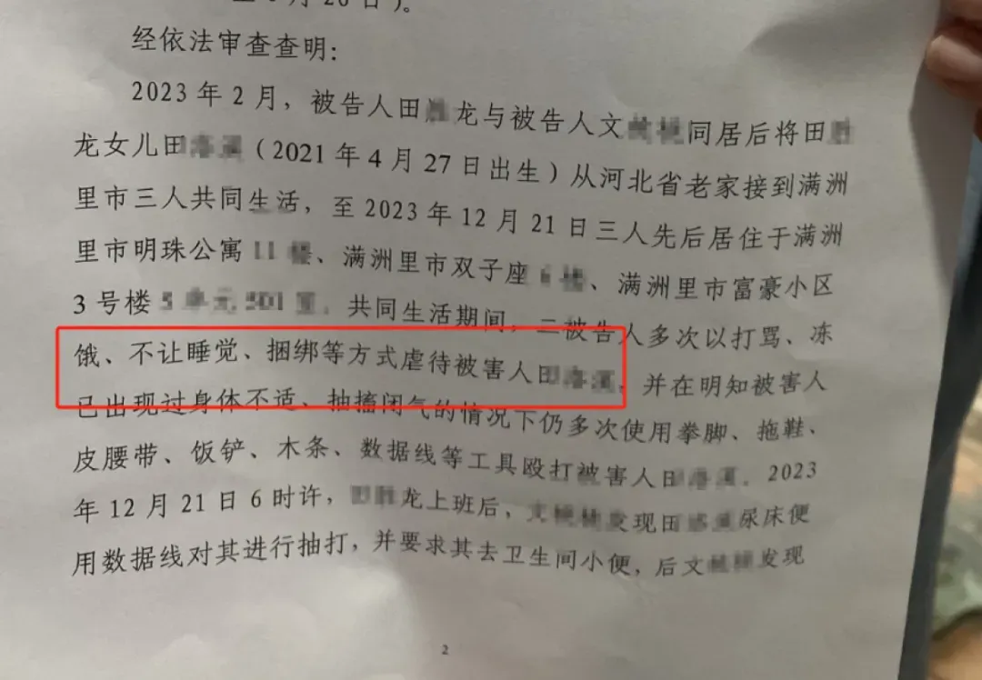检方指控,在共同生活期间,被告人田某龙与被告人文某桃多次以打骂、冻饿、不让睡觉、捆绑等方式虐待被害人甜甜,并在明知被害人已出现过身体不适、抽搐闭气的情况下仍多次使用拳脚、拖鞋、皮腰带、饭铲、木条、数据线等工具殴打甜甜。2023年12月21日6时许,田某龙上班后,文某桃发现甜甜尿床,便用数据线对其进行抽打,并要求其去卫生间小便,后文某桃发现甜甜全身抽搐倒在卫生间,实施简单救助后,与闻讯赶回的田某龙二人将其送至医院,但孩子抢救无效死亡。2024年1月17日,当地公安部门出具的司法鉴定报告显示:甜甜系在全身多发性软组织挫伤的基础上,因胸部受到钝性外力作用,造成右心房破裂,导致心包积血、急性心脏压塞而死亡。当晚,李婷婷再次向记者确认庭审过程中的一些细节时,她告诉记者,有些虐待孩子的行为,她也是第一次听到。“我听到这些细节后,我头疼心口疼,脑子都是嗡嗡的。”李婷婷表示,庭审中,田某龙和文某某的辩护律师,以虐待罪为两人辩护,并称两人的行为是“教育过当”,这在她和母亲看来是不能接受的。李婷婷表示,2023年2月,小甜的生父田某龙突然回河北邢台强行带走孩子,还把此前居住的房子搬空了,从此她就与田某龙失去了联系。之后,李婷婷一直想尽办法找孩子,还去联系了田某龙的父母,但对方表示自己也无法联系到田某龙。李婷婷的母亲李女士也说,田某龙的父亲要么不接电话,要么接听电话后要求李婷婷不要再找了。李婷婷与田某龙的“失联”状态,一直延续到2023年12月21日——那天,李婷婷被警方告知,未满三周岁的女儿小甜已经死亡。“我接到消息后就赶去了内蒙古,在殡仪馆里见到了孩子,她身上都是伤。”回忆起当时,李婷婷哭着说,见到小甜遗体的那一刻,她就“瘫了”,都不知道为什么会这样。原来小甜在被田某龙带走后,长期遭受到田某龙及其女友文某某的打骂、冻饿、不让睡觉、捆绑等方式虐待。甚至,在虐待行为中,田某龙和文某某还存在拍摄录像的情况。