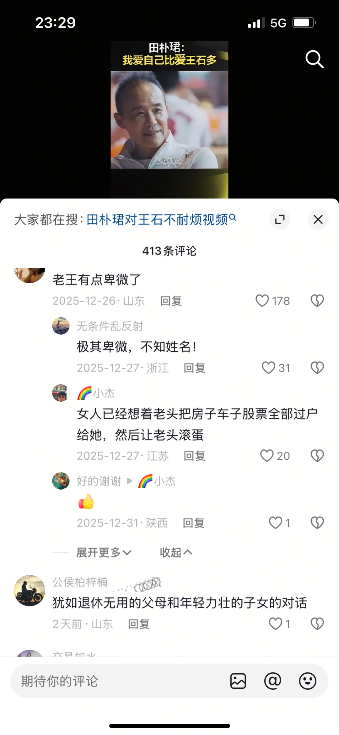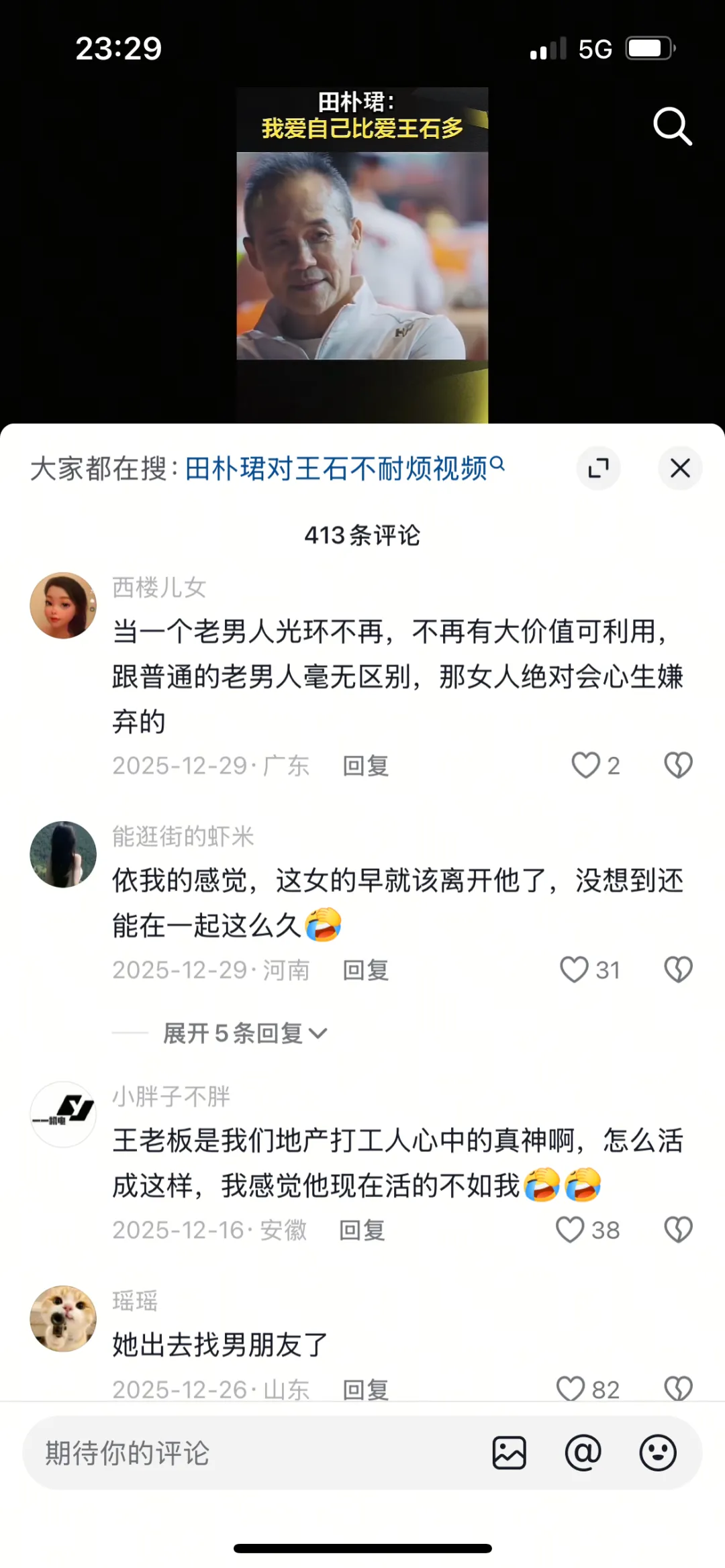 大佬们有律师团、会计师、财富顾问。我们普通人虽然请不起团队,但在关键时刻咨询专业人士,花的钱可能为你避免百倍的损失。作为旁观者,我们要相信爱情,我其实更愿意相信王石是个“恋爱脑”,我也不诋毁任何一个求上进的女性,不管是哪种形式的“上进”。但凡婚后老王给小田足够的买买买,足够的馈赠,足够的安全感,也许小田也不需要这么蹦跶,也不需要拉着本该退休享受生活慢节奏天伦之乐的74岁的老人还出来营业!借用段永平的话:老王,对自己好一点。当然如果小田确实超级有事业心,那确实他们之间的节奏是不一致的,只能在婚姻里各找舒适度吧,不然就如传闻中所说,不装了,早离早解脱!