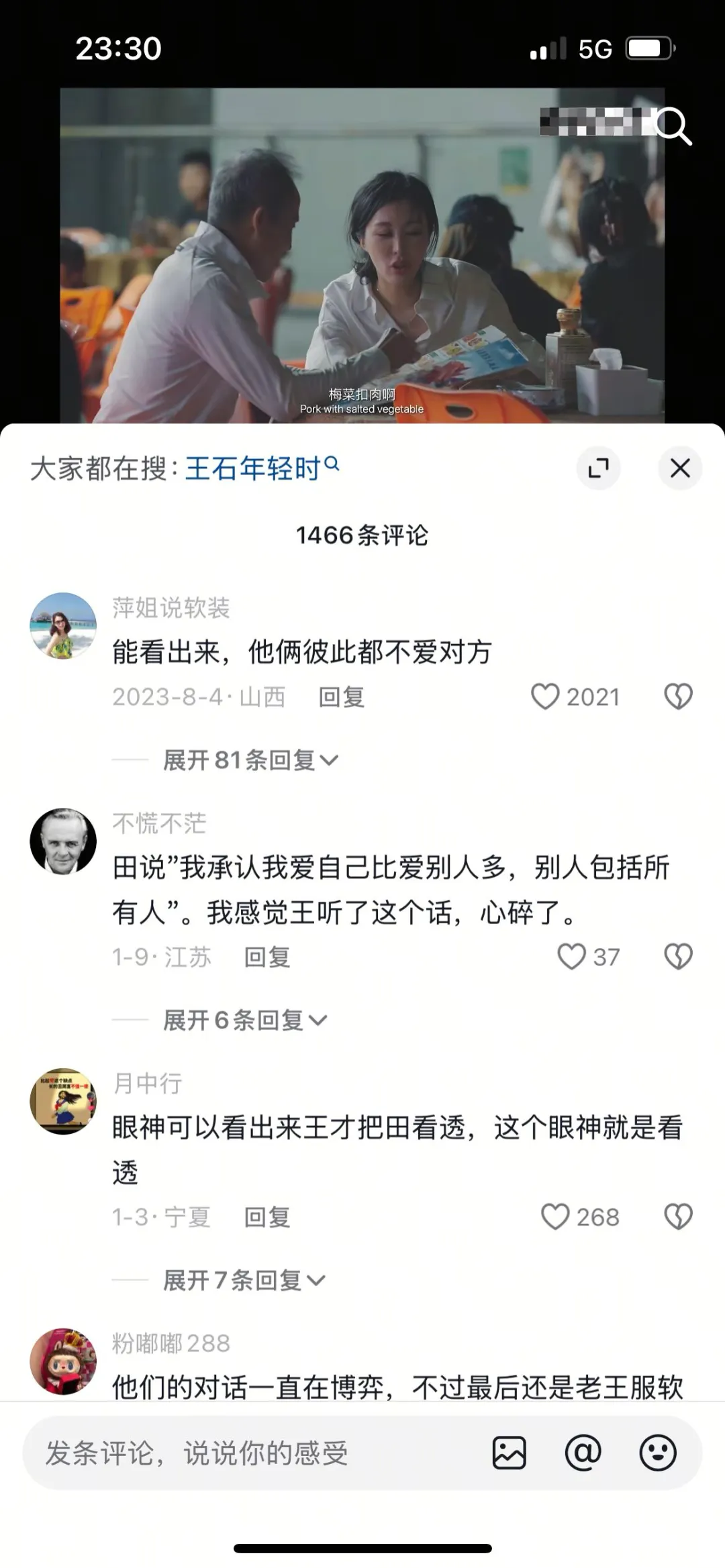 深夜刷到王石田朴珺的十周年相处视频,两人对视的眼神里暗藏玄机,高手对决,杀人于无形:老王先发制人透露出经常在家煮“笨笨的红烧肉”,翘首盼望小田归家陪伴,镜头里的眼神却散发出我当初怎么会看上这个Level的田小姐??别欺我老无力!! 小田则回避眼神先发制人PUA大家都是爱自己多一点,我宁愿开会都不回家,我就是厌倦你了,我看不上现在的你了!大家体面一点,给你台阶下了,就当最后再帮个忙,扭转一下我的风评吧!当然,这段视频的评论区比视频本身还精彩。