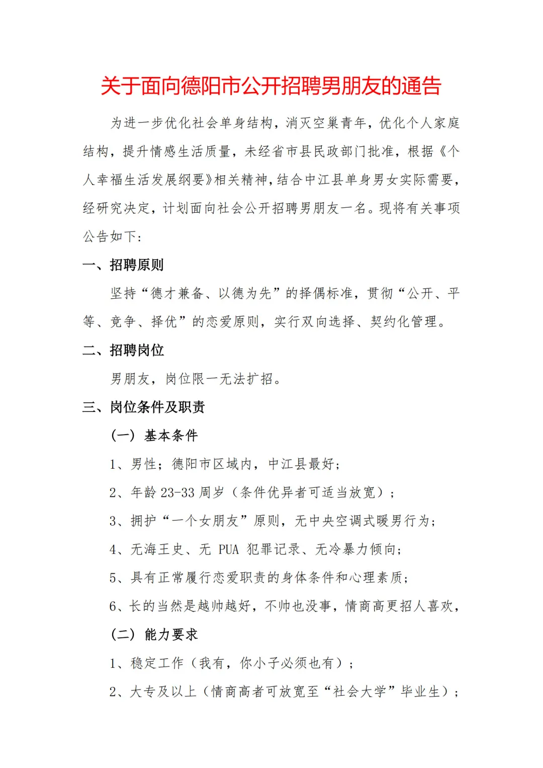 >关于面向德阳市公开招聘男朋友的通告