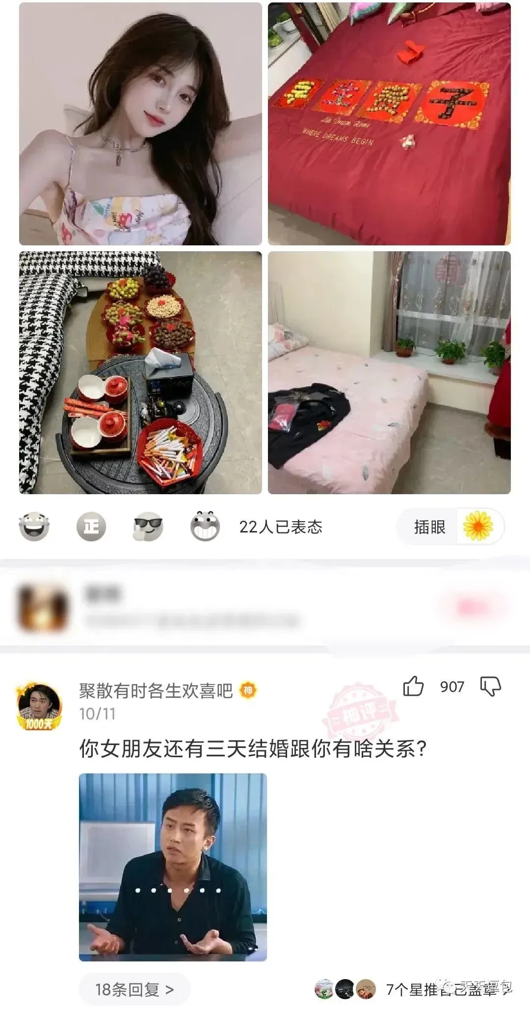 神回复:逗包们,这是我女朋友,还有三天就要结婚了,人生第一次,感觉好紧张啊,逗包们能不能给我打打气.