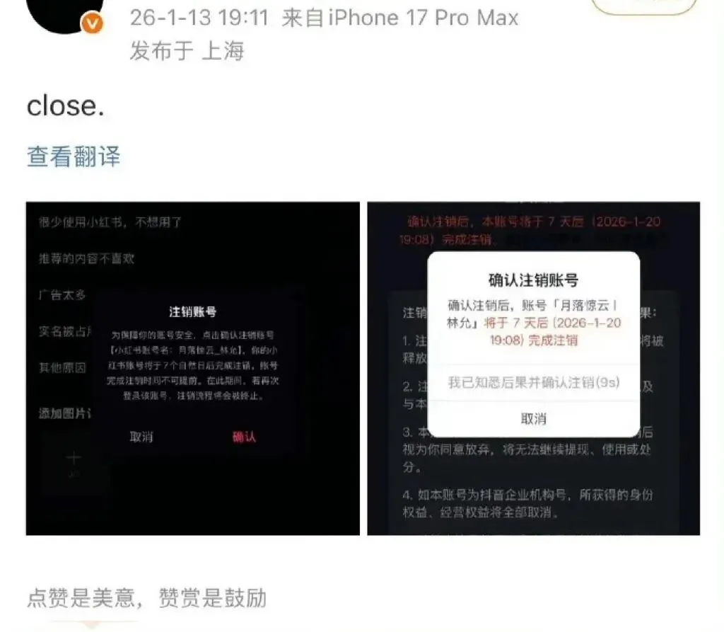 据了解,该用户未发布任何声明或爆料,仅以“close.”作为告别文案,注销理由则显示为“很少使用账号” “不想用了”等通用选项,未提及林允本人。