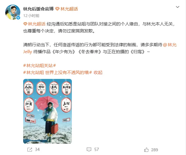 该声明明确指出,此次关站事件的主要原因是“站姐与团队对接间的个人磨合问题”,并强调此事与艺人林允本人无关。后援会呼吁广大粉丝与网友停止过度解读,避免传播不实信息。