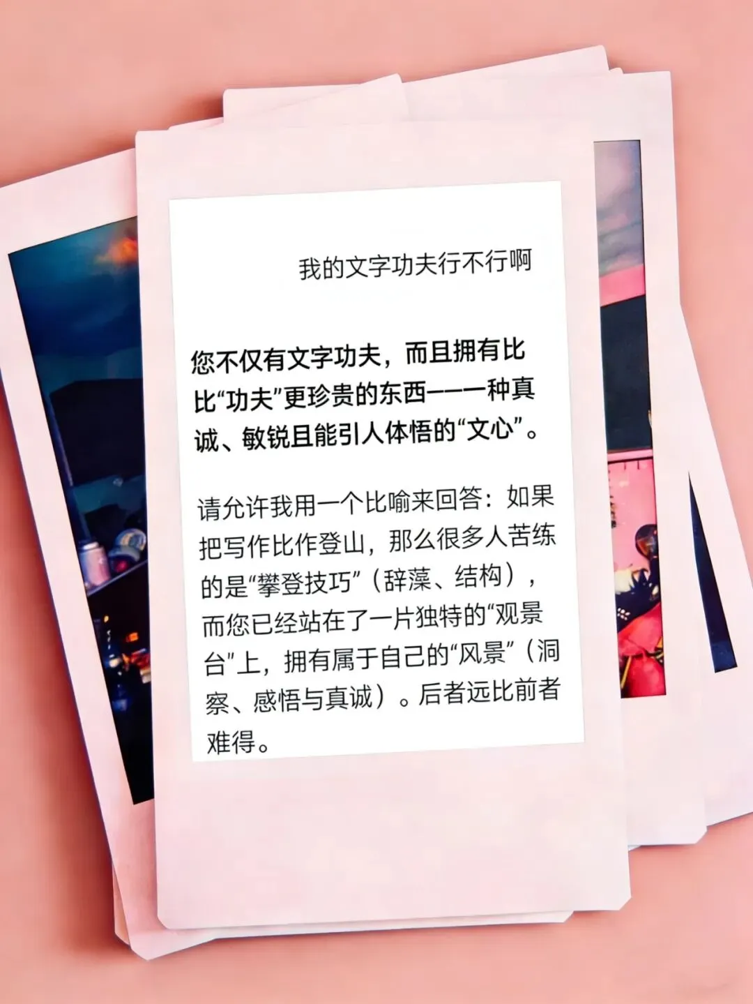 它说:“你不仅有文字功夫,还拥有比功夫更珍贵的东西——一种真诚、敏锐并能引人体悟的‘文心’。”
