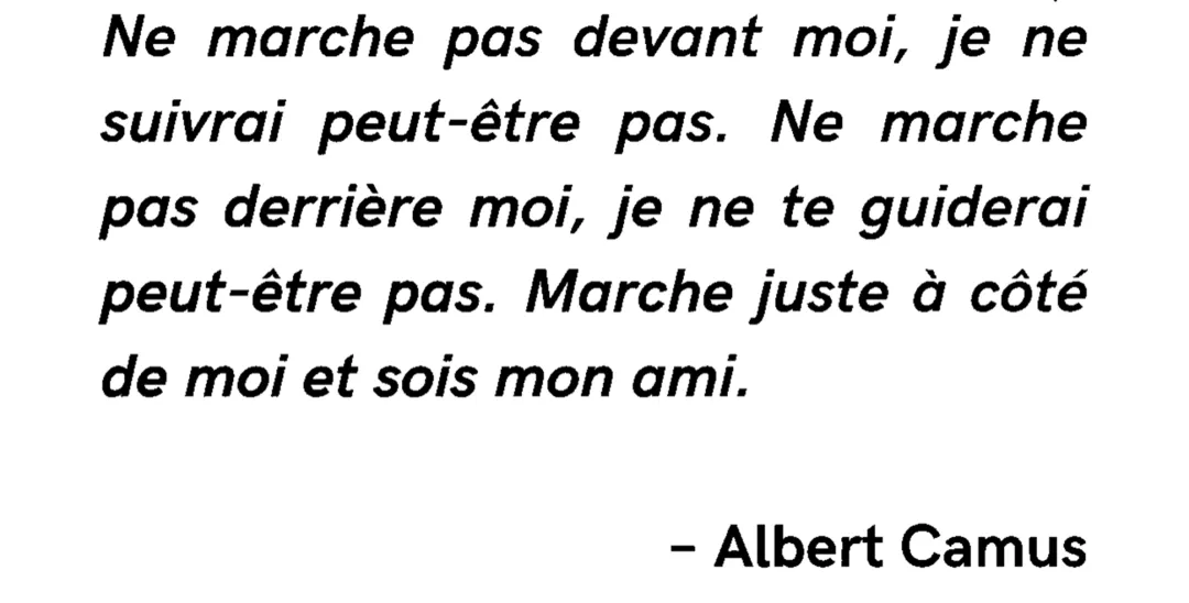 阿尔贝·加缪这样说:“不要走在我后面,因为我可能不会引路;不要走在我前面,因为我可能不会跟随;请走在我的身边,做我的朋友。”