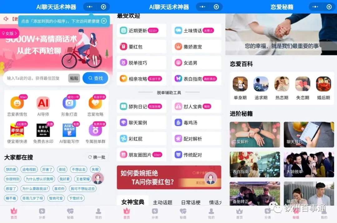 在这里,我们为您提供了海量有趣的聊天技巧,约会技巧,教穿搭,场景模拟,护肤等....你再也不用感觉聊天很枯燥无味啦!再也不会出现尬聊的情况啦!还是单身的小伙伴们,可以随时来这里搜索你喜欢的恋爱话术,轻松助你成功恋爱交友哦!恋爱回复话术,搜索一下立即获得精彩回复。精彩回复,一键复制,有趣的回复让聊天变得更愉快。