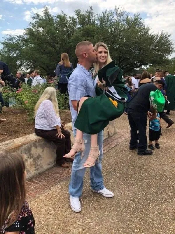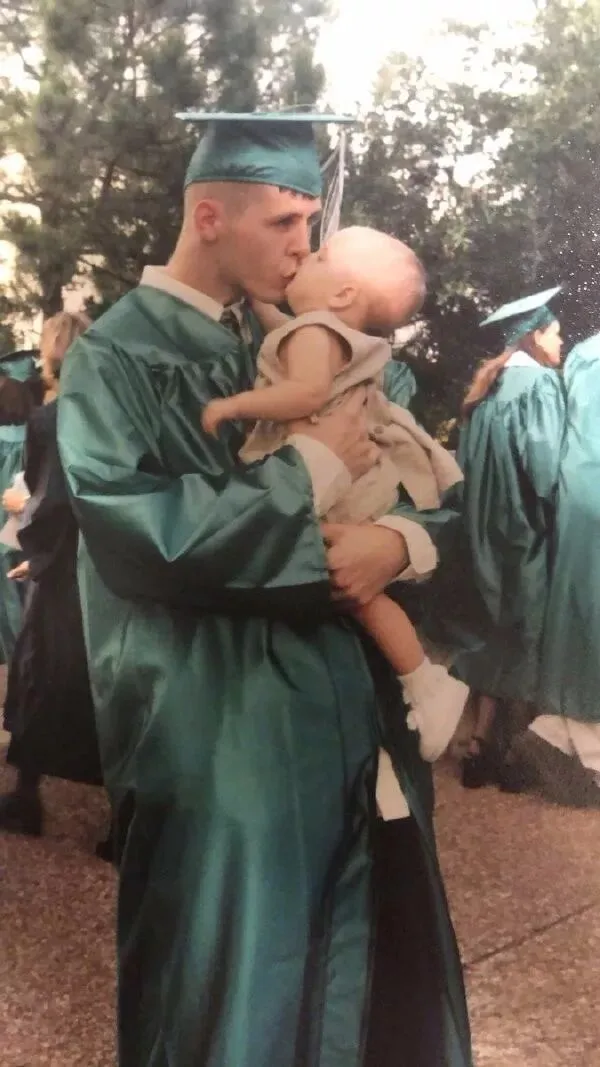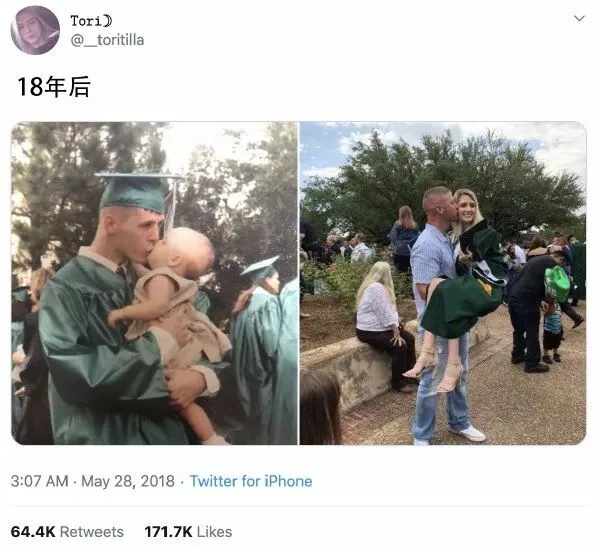 由图推理可得绿色礼服是高中毕业礼服,女生发文说18年后她毕业了,18岁大概率是高中毕业,而她穿的礼服和他爸是类似的绿色礼服,进而得出这老哥高中毕业就当爹了