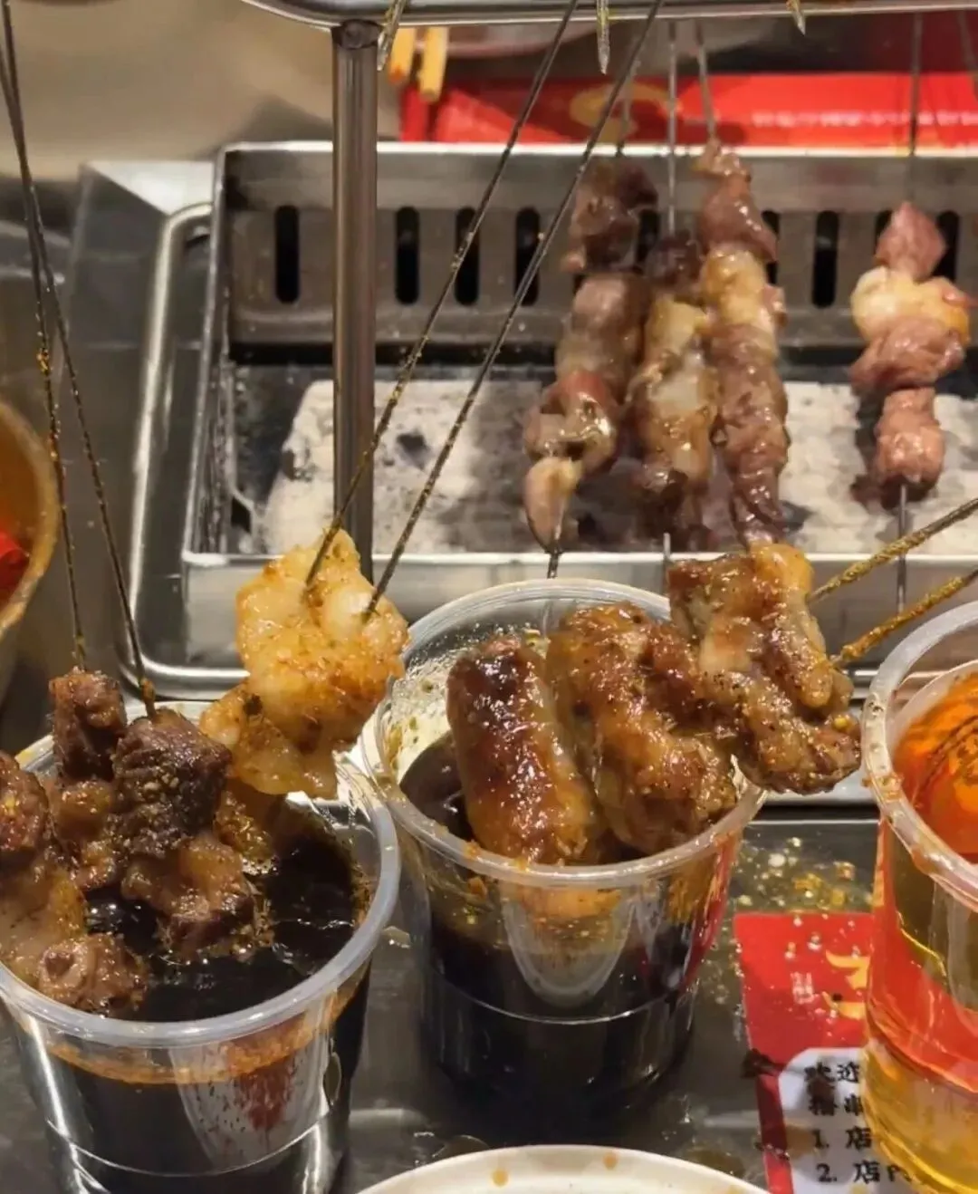 店内,人很多,木头桌上摆着烧烤架。我第一次见还需要自己烤的烧烤。点完餐,服务员端上来半熟的串串。蘸料放在小盘子里,已经配得好好的。