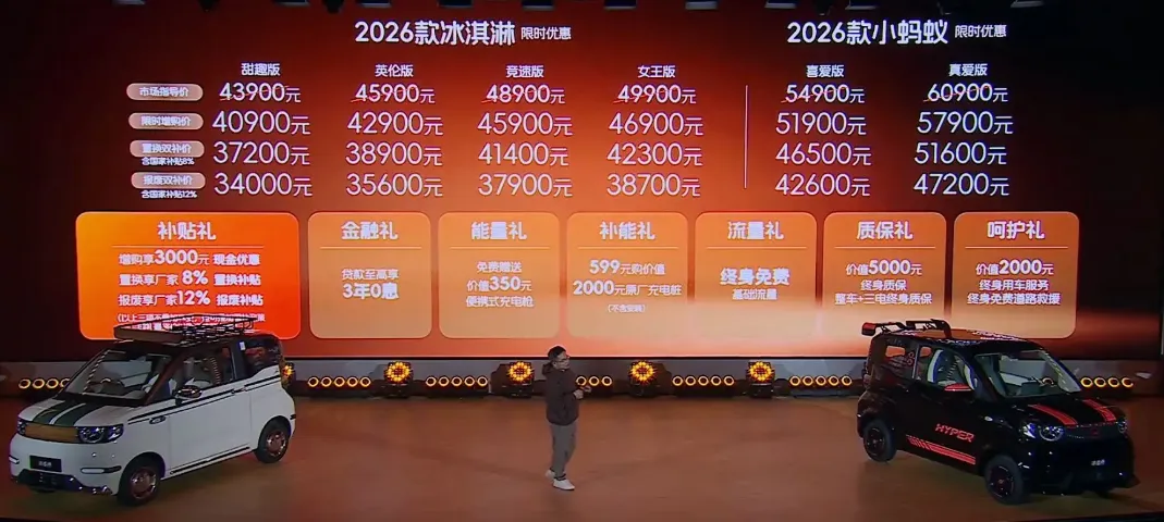 总是慢半拍的奇瑞新能源,这回动作挺快,2026款的冰淇淋和小蚂蚁这就安排上了。先说冰淇淋这回一共推了4个配置,指导价从4.39万起,还有个限时增购价,最低4.09万能拿下。