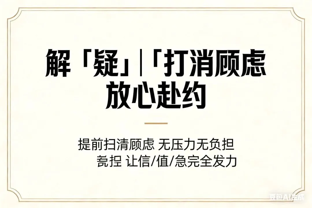 很多时候对方犹豫不来,不是不信任、不认可价值,而是心里有顾虑没解开:怕被说服、怕麻烦、怕花钱。咱们提前预判、主动化解顾虑,前面的“信、值、急”才能完全发力,彻底“馋”到对方。