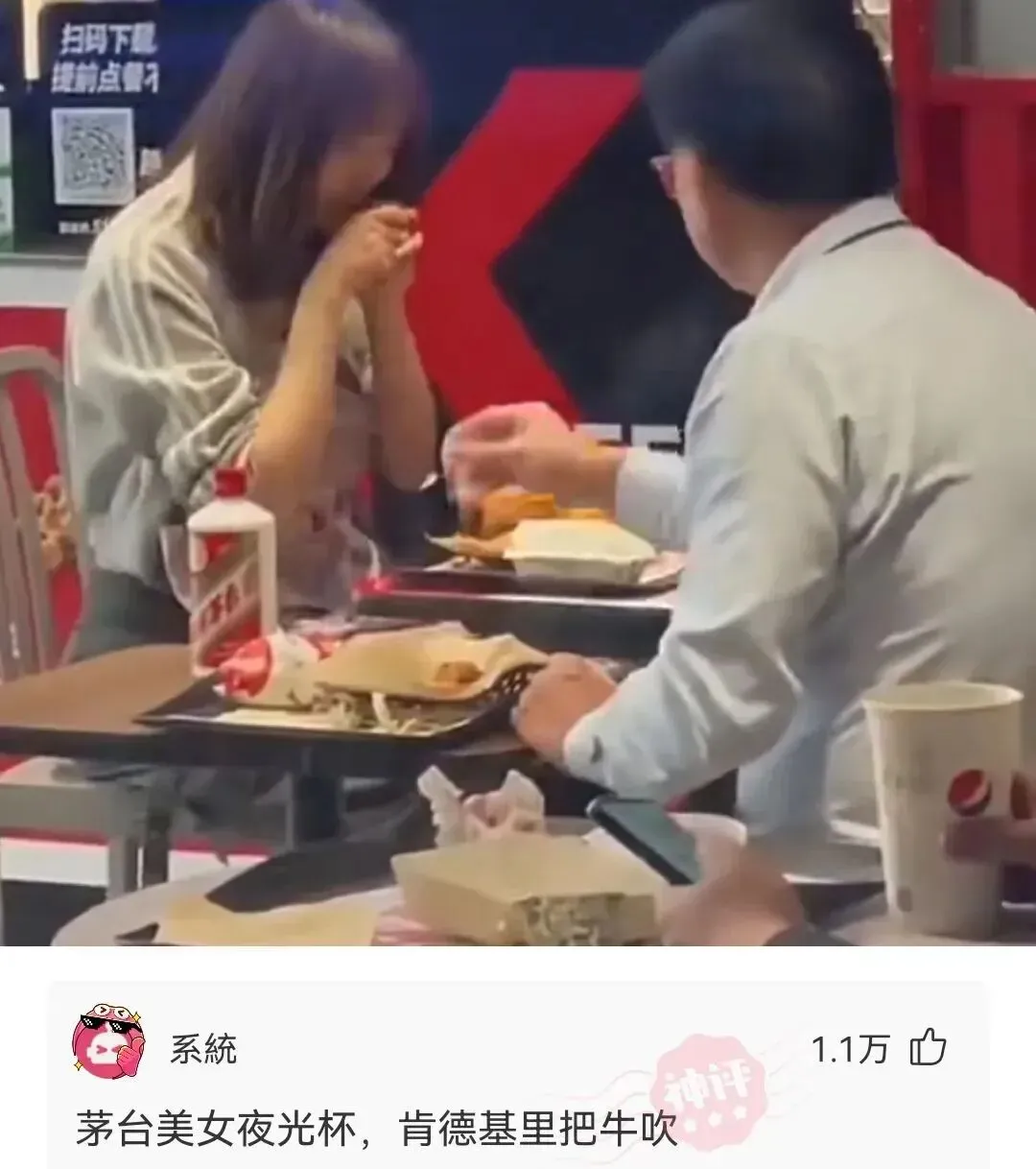 大叔肯德基一人独饮茅台酒,旁边坐着的女生忍不住,竟要了一杯。网友:我说眼里咋有光,原来是有茅台