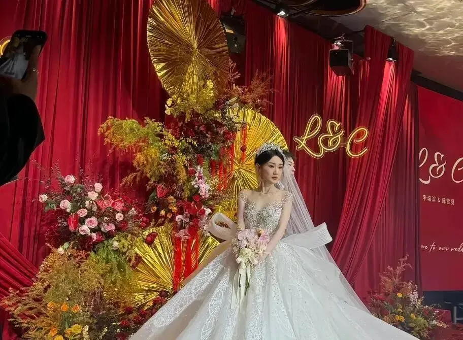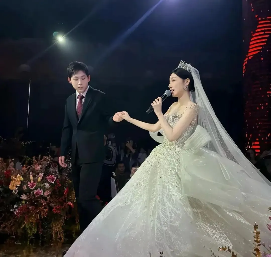 婚礼现场流出的视频和照片,那才叫一个甜。 陈雪凝穿着定制的拖尾婚纱,戴了个据说超过3米的超长头纱,仙气飘飘的,跟当年那个唱着伤感情歌的小女孩完全不一样了。