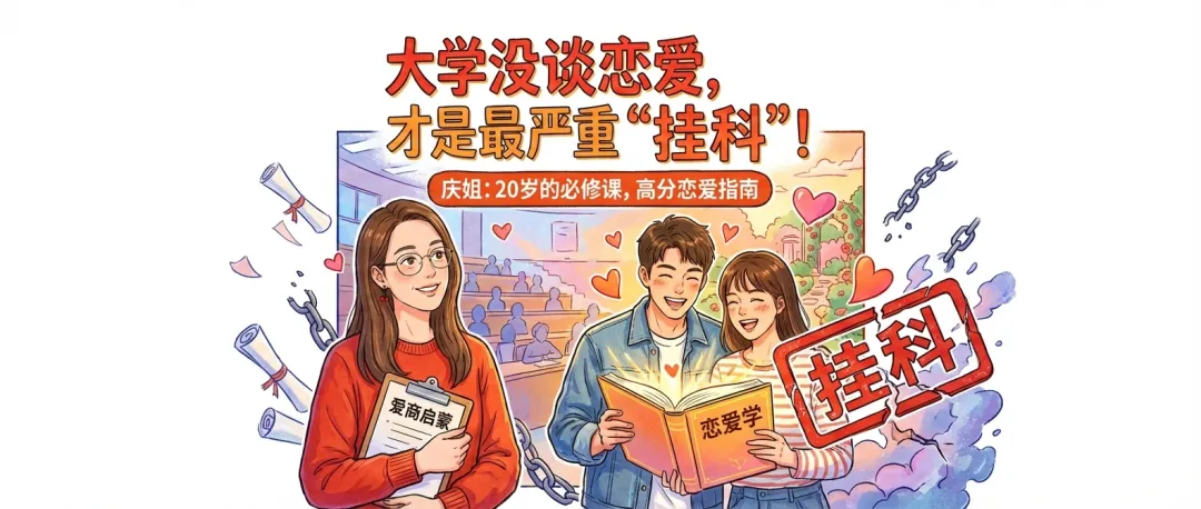 当大多数家长还在叮嘱“千万别挂科”时,作为一名大学老师,我想告诉20岁的你们一个真相:大学四年如果你没谈过恋爱,这才是人生中最严重的一场“挂科”。这不只是一场心动,更是一次关于“爱商”的终极启蒙。庆姐带你拆解:如何谈一场不内耗、不卑微、不仅看结果的高分恋爱?踏进大学校门那刻起,很多家长叮嘱的是:好好学习,千万别挂科。 但作为一名大学老师,同时也是一个大学生的亲妈,我想说的是:大学四年你如果没谈过恋爱,这才是你人生中最严重的一场“挂科”。 20岁的鲜活生命,使命不应只是绩点和考证。辛辛苦苦卷了12年,你终于进了一个可以自由试错、合法心动的园子,这将是你人生中最重要的一个“爱商”启蒙期。别老缩在寝室的赛博世界里,去好好的、精致的谈一场恋爱吧!