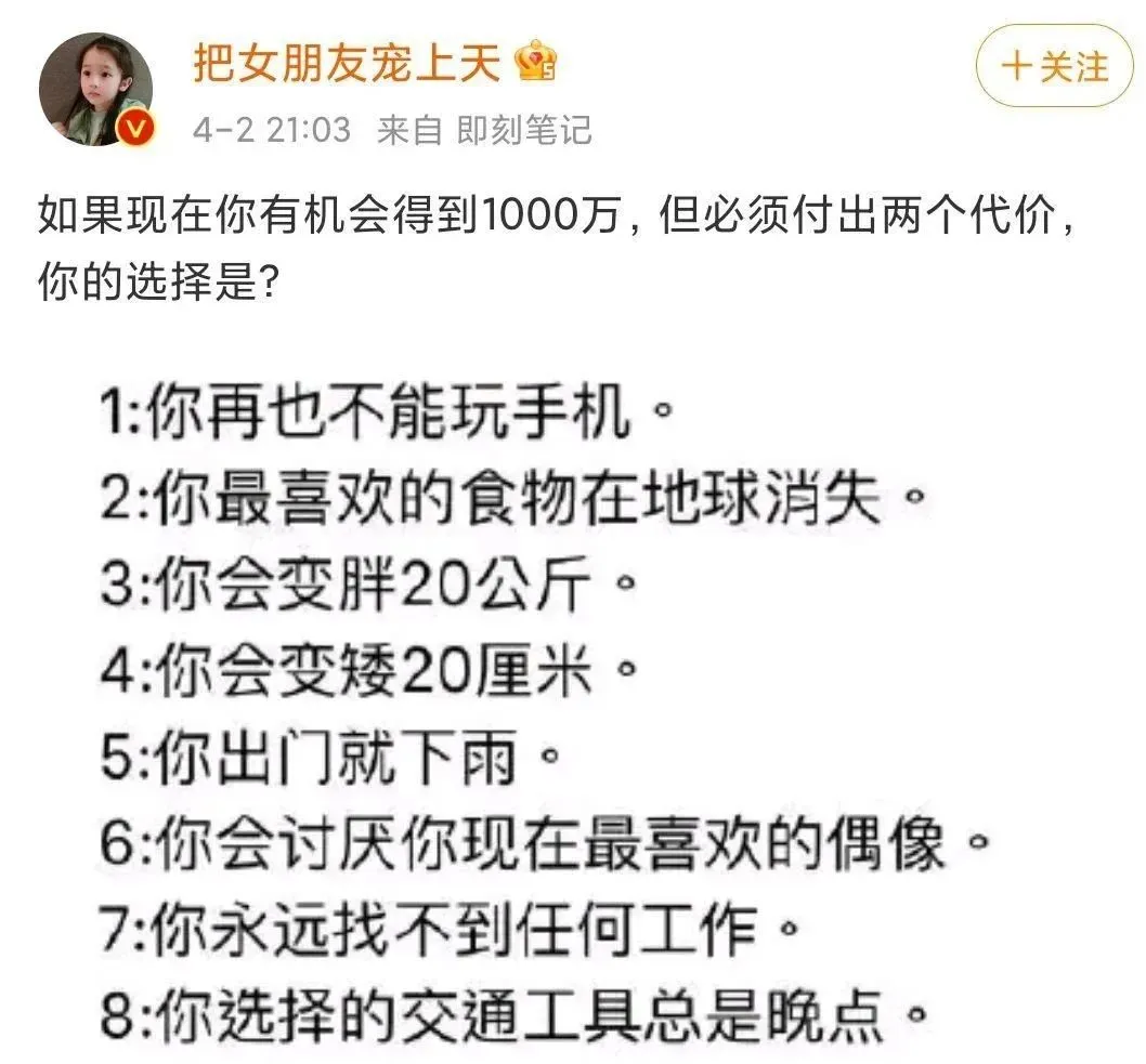 如果现在你有机会得到1000万,但必须付出两个代价,你的选择是?