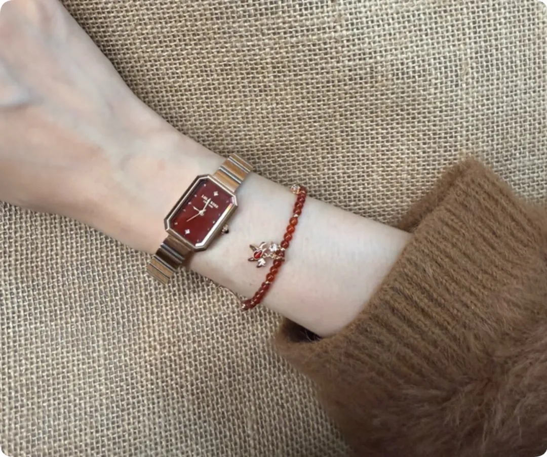它天然红玉髓宝石表盘,表圈镶嵌锆石,搭配殷红色竹节纹表带,整体红色配置,非常漂亮的设计。