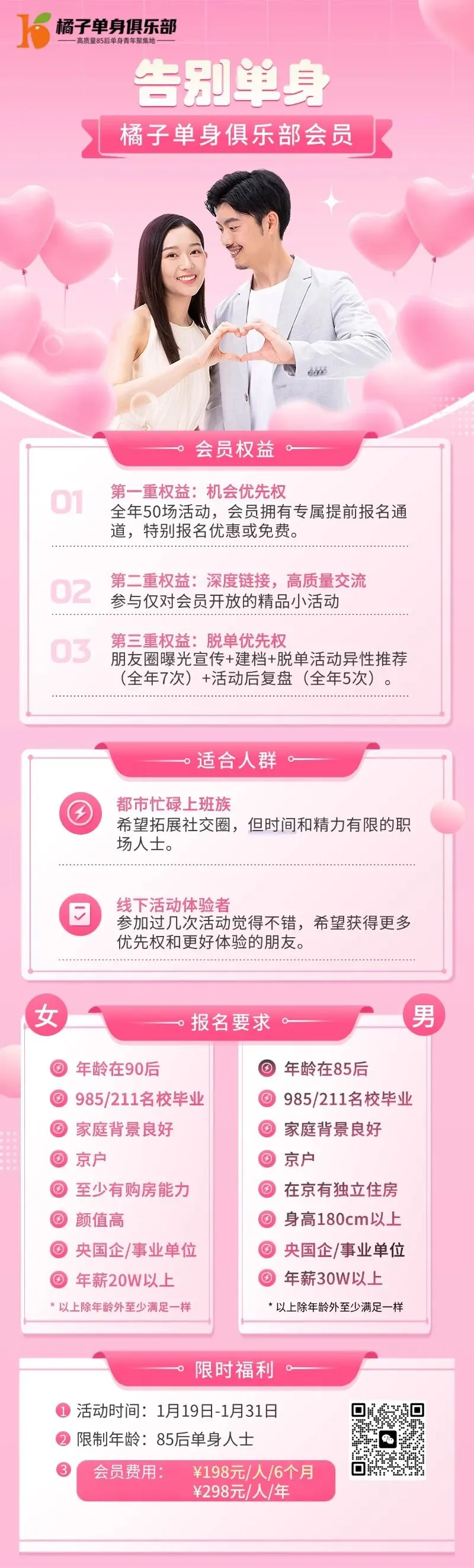 橘子社交·单身俱乐部俱乐部的的理念在于帮助在一线及超一线城市有对恋爱渴望,有脱单需求的青年,通过帮助他们建立高质量社群,帮助大家实现破圈交友,让大家在自然而然的活动相处中产生情绪,我们提供会员服务和1V1爱情情感咨询。橘子单身俱乐部活动目前主推的活动是:周五微醺之夜,京郊露营,京郊徒步,二十四节气系列活动,周边游;同时在开发定制小团社交活动(根据活动调性欢迎老会员脱单后携另一半参加)。我们坚持“让爱,自然发生”的slogan,摒弃传统婚恋无趣/无聊/无内容,坚持用优质活动,吸引优秀单身青年!