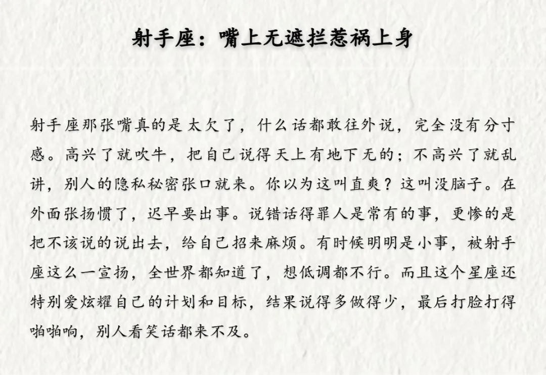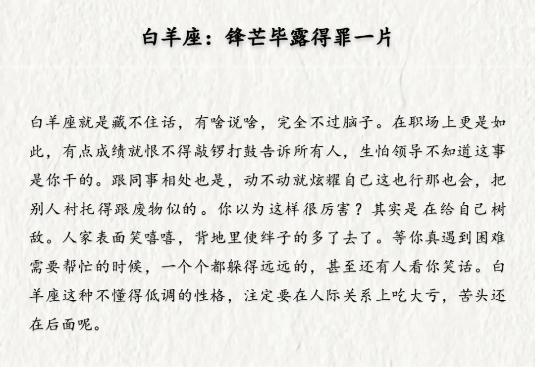 有些人啊,就是不懂得收敛。越是喜欢在人前显摆,越是恨不得全世界都知道自己有多厉害,结果呢?往往混得越惨。这不是迷信,是真实的人生规律。你想想看,那些真正过得好的人,哪个天天嚷嚷自己多牛?都是闷声发大财。反倒是那些整天张牙舞爪、生怕别人不知道的,最后都把自己作得够呛。今天就来说说这三个星座,越是张扬,苦日子就越多,不信你看看身边人,准得很。