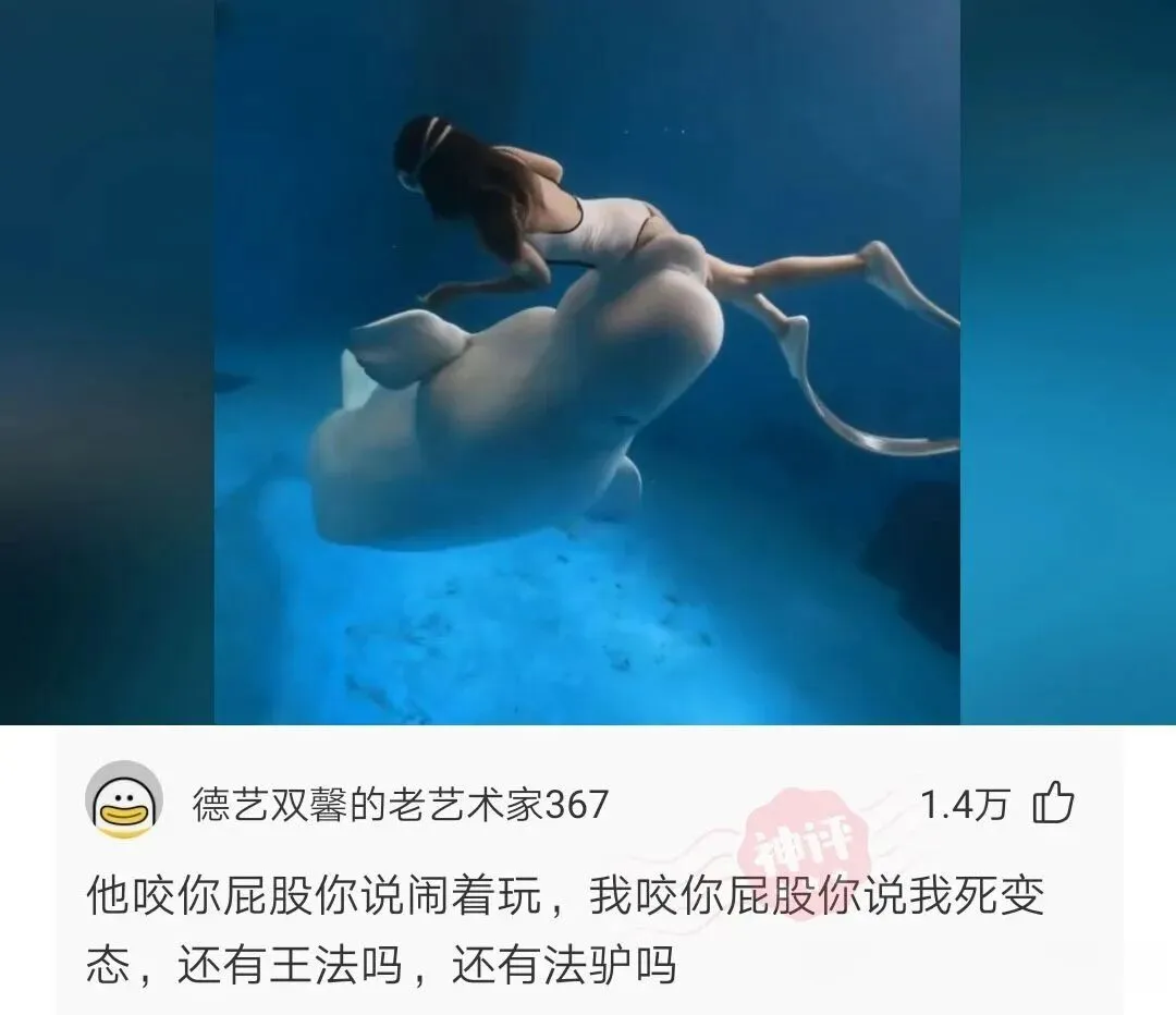 女子在海洋馆潜水,被自鲸一口咬住屁股,女子:它把我当玩具了,没用力~