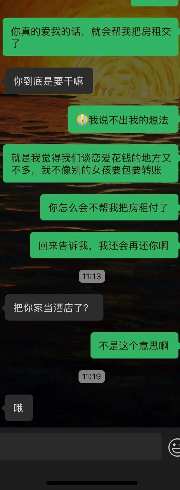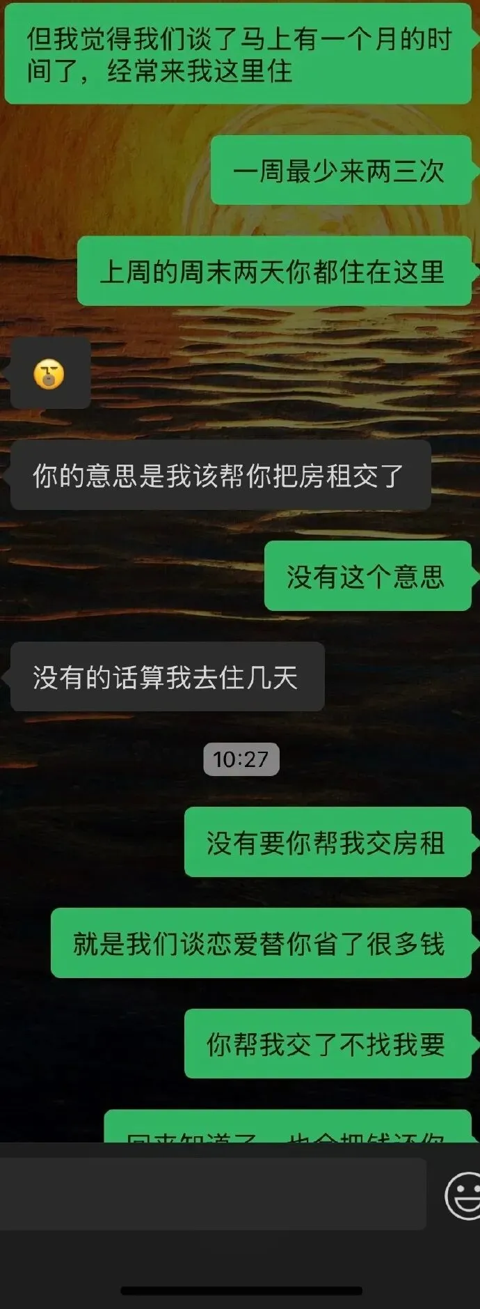 标题:男朋友不愿意帮我付房租,我觉得他没有很爱我,是我的问题吗? 我们恋爱从24年9月开始谈,他已经工作但是和爸妈住在一起,我自己租房住,他和我恋爱后知道我一个人住,就很少和我去外面,基本上都是在我的出租屋过夜,他一周会来两到三次,周末不上班会过夜再回家,这快有一年的时间里,在我的记忆里我们只去外面住过4次,这4次里面有2次是外出旅游不得不住酒店,另外2次是我们恋爱初期,他带着我酒店,后面我说可以去我这里,替他省掉一些开房钱留着我们出去约会用,之后他就一次都没有去过酒店。