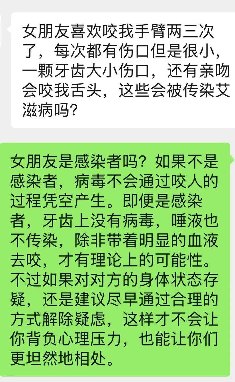 “女朋友喜欢咬我手臂两三次了,每次都有伤口,但是很小,一颗牙齿大小伤口,还有亲吻会咬我舌头,这些会被传染艾滋病吗?”