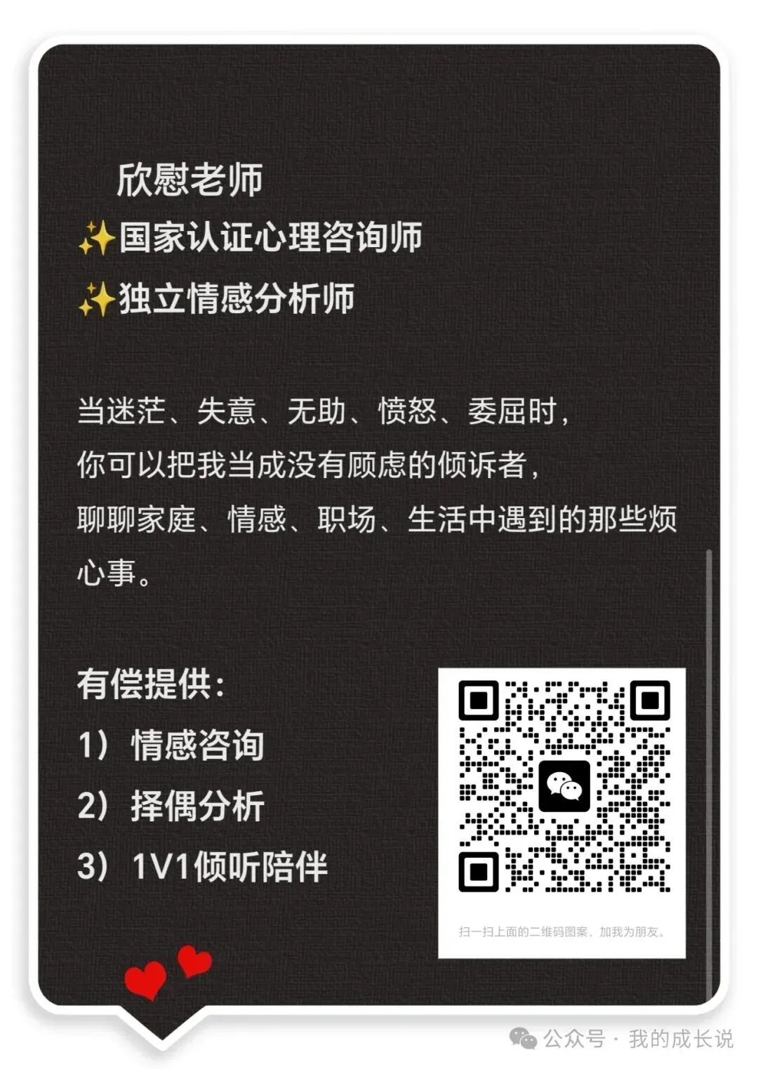 若在婚恋关系中遇到疑惑,需详细的分析指导,可添加下方图片微信二维码,与我预约1V1情感咨询。