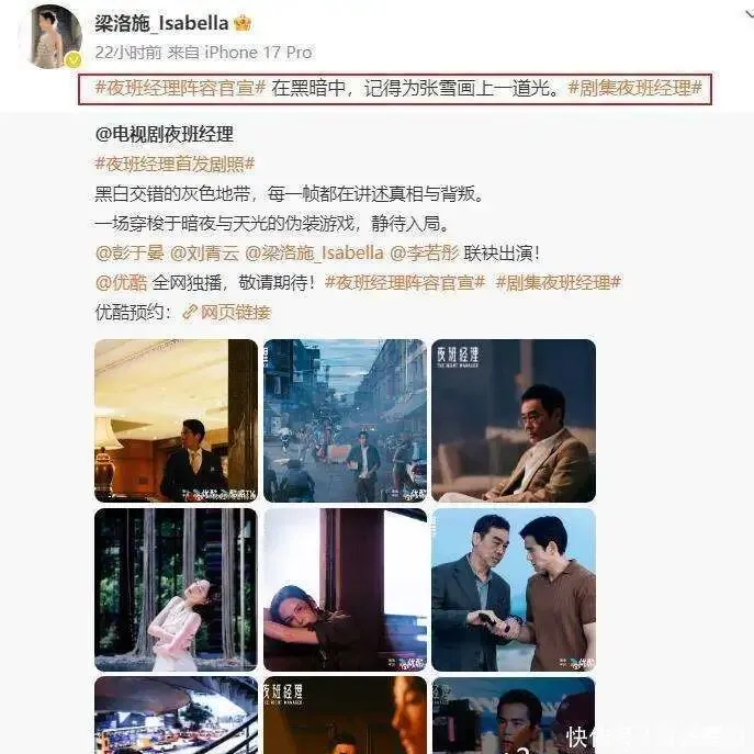 梁洛施最近再次成为大家热议的焦点!1月15日,她终于在社交平台露面,为自己参演的新剧《夜班经理》打了个大大的广告。这部剧的阵容堪称豪华——刘青云、彭于晏、李若彤等实力派演员悉数加盟,而她在剧中饰演的张雪,和商界大佬郭礼儒(刘青云饰)关系暧昧,此外还与卧底警察陈通(彭于晏饰)有着复杂的纠葛,剧情的张力堪称十足,令人一看就想追下去。