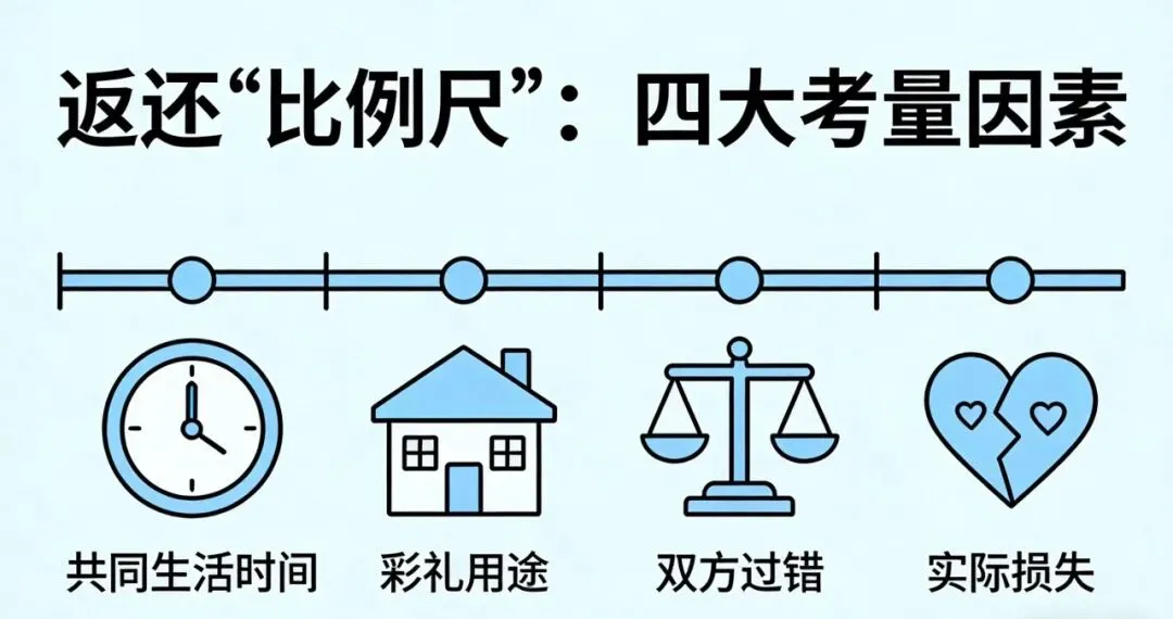 彩礼返还并非简单的“全有或全无”,主要考量以下因素:① 共同生活时间:已长期、稳定共同生活,尤其育有子女的,返还比例显著降低甚至不予返还。② 彩礼实际用途:已用于双方共同生活、筹备婚礼等合理消耗的,应在返还数额中予以扣减。③ 双方过错及实际损失:如因给付方过错导致婚约解除,或收受方怀孕、流产等造成身心伤害的,会相应减轻返还责任或扣减返还数额。3. 具体情形下的裁判规则