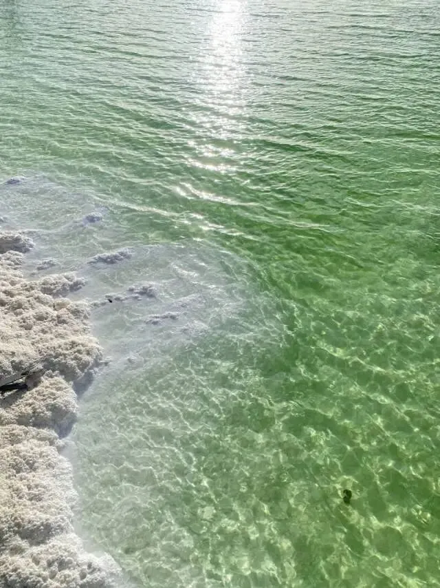 在茶卡盐湖,看见了苹果绿的湖泊,路边上还有各种颜色的小水沟。