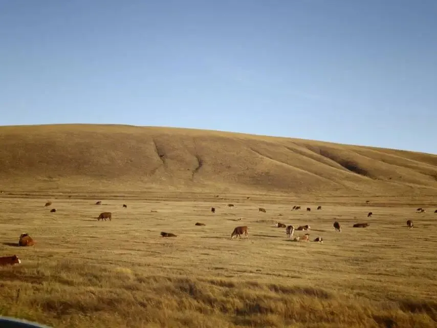 我们看到了一望无际黄色的草原,看到到处都是牛羊,还有收草的人。