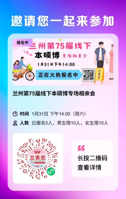 报名要求:男生:26-35岁,本硕博学历,身高175cm及以上,限国企/事业单位/公务员,未婚