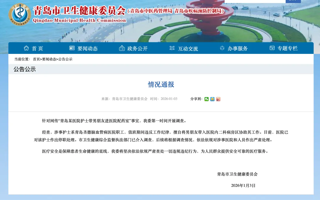 1月3日,青岛市卫生健康委员会发布情况通报:针对网传“青岛某医院护士带男朋友进医院配药室”事宜,青岛市卫生健康委第一时间开展调查。