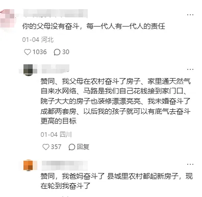 “我父母在农村奋斗了房子、家里通天然气自来水网络、马路是我们自己花钱接到家门口、院子大大的房子也装修漂漂亮亮、我未婚奋斗了成都两套房、以后我的孩子就可以有底气去奋斗更高的目标。”