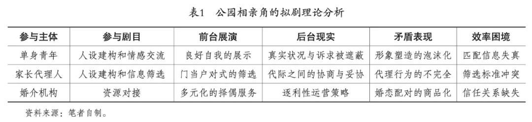 公园相亲作为主流婚恋实践场域,其运作逻辑对透视我国婚姻制度的传承与变革具有典型意义。本研究以拟剧理论作为分析框架,并不是对既有研究视角的简单置换,而是尝试实现理论的突破与整合。其一,突破个体化视角下代际间的二元对立叙事,揭示家长与子女通过人设建构形成协作性表演契约,展现家庭权力结构与个体诉求的动态平衡。其二,在承认结构约束的同时,强调青年及家长通过话术策略、形象管理等能动性实践,重构婚恋决策中的主体性空间。其三,针对媒介化研究对线上技术的路径依赖倾向,考察线下相亲场景中面对面凝视与互动,阐明其与线上婚恋平台的互补性,打破技术决定论的单一解释框架。